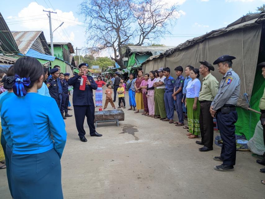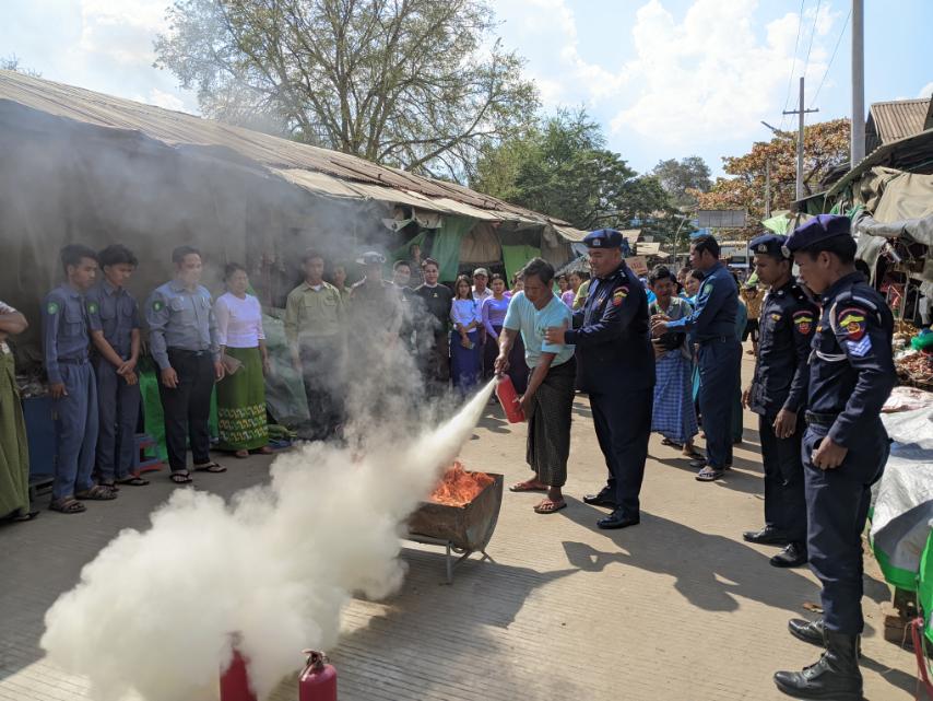 ထိုသို့ဇာတ်တိုက်လေ့ကျင့်ရာတွင် မြို့နယ်နယ်မီးဦးစီးမှူး ဦးဇေယျာအောင် ဦးဆောင်၍ သန္ဓေတပ်ဖွဲ့ဝင် ၁၀ ဦးက စျေးသူ၊ စျေးသားများ၊ စျေးအကျိုးတော်ဆောင်အဖွဲ့ဝင်များကို မီးသတ်ဆေးဘူးဖြင့် မီးငြှိမ်းသတ်မှုလေ့ကျင့်ပေးခြင်း၊ မီးငြှိမ်းသတ်ရေးယာဉ်ဖြင့် မီးငြှိမ်းသတ်ခြင်းလက်တွေ့ဇာတ်တိုက် လေ့ကျင့်ခြင်းများကို ဆောင်ရွက်ရာ မြို့နယ်စီမံခန့်ခွဲရေးနှင့်အုပ်ချုပ်ရေးကော်မတီဥက္ကဋ္ဌ ဦးတင်အောင်ဝင်းနှင့်အဖွဲ့ဝင်များ၊ မြို့နယ်စည်ပင်သာယာရေးအဖွဲ့ အမှုဆောင်အရာရှိ ဒေါ်နွယ်နီထွန်းနှင့် တာဝန်ရှိသူများက ကြည့်ရှုအားပေးခဲ့ကြောင်း သိရသည်။
