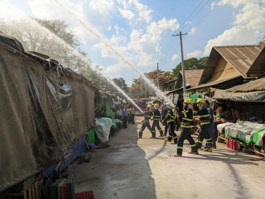 မန္တလေးတိုင်းဒေသကြီး မလှိုင်မြို့၊ အမှတ်၄ရပ်ကွက်ရှိ မြို့နယ်စည်ပင်သာယာအဖွဲ့ပိုင် မြို့မစျေးကြီးတွင် မီးသတ်ဆေးဘူးဖြင့် မီးငြှိမ်းသတ်မှုလေ့ကျင့်ပေးခြင်း၊ မီးငြှိမ်းသတ်ရေးယာဉ်ဖြင့် မီးငြှိမ်းသတ်ခြင်းလက်တွေ့ဇာတ်တိုက်လေ့ကျင့်ခြင်းတို့ကို ယမန်နေ့မွန်းလွဲပိုင်းက ဆောင်ရွက်ခဲ့ ကြောင်း သိရသည်။