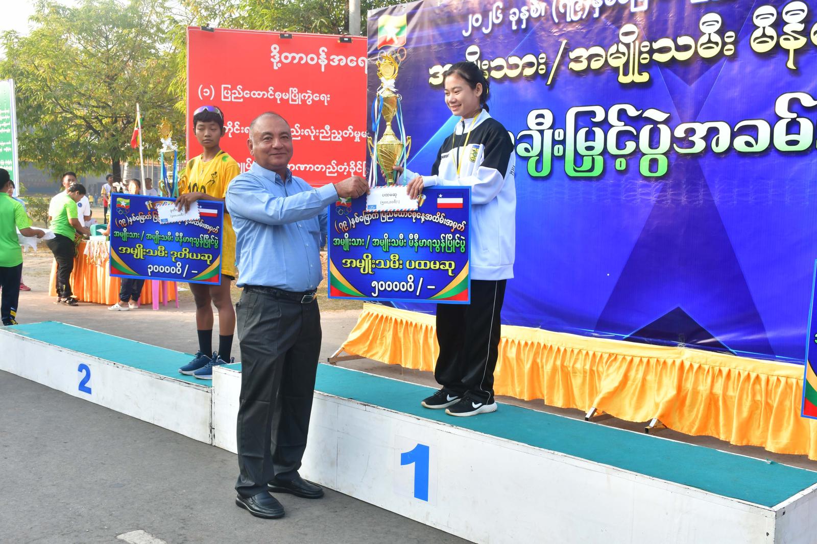 ပြိုင်ပွဲကျင်းပအပြီးတွင် ဆုချီးမြှင့်ပွဲအခမ်းအနားကို ဆက်လက်ကျင်းပရာ ပြည်နယ်အဆင့် ဌာနဆိုင်ရာများနှင့် ပြည်နယ်အစိုးရအဖွဲ့ဝင်များက အမျိုးသား/အမျိုးသမီး မီနီမာရသွန်ပြိုင်ပွဲတွင် နှစ်သိမ့်ဆု (၆) မှ (၃၀) ထိ ရရှိကြသူများအား တစ်ဦးချင်းလည်ဆွဲဆုနှင့် ငွေသားဆုများ ပေးအပ်ချီးမြှင့်ကြပြီး ပြည်နယ်လုံခြုံရေးနှင့်နယ်စပ်ရေးရာဝန်ကြီးဗိုလ်မှူးကြီး မင်းသူကျော်က အမျိုးသမီးအသက်အငယ်ဆုံး ပြိုင်ပွဲဝင်ဆု၊ အသက်အကြီးဆုံးပြိုင်ပွဲဝင်ဆုနှင့် ပဉ္စမ၊ စတုတ္ထ၊ တတိယ၊ ဒုတိယနှင့် ပထမဆု ရရှိကြသူများကို တစ်ဦးချင်းလည်ဆွဲဆု၊ ငွေသားဆုနှင့်ဆုဖလားများကို ပေးအပ်ချီးမြှင့်ပြီး ပြည်နယ်တရားလွှတ်တော်တရားသူကြီးချုပ် ဦးညွန့်လင်းက အမျိုးသား အသက်အငယ်ဆုံးပြိုင်ပွဲဝင်ဆု၊ အသက်အကြီးဆုံးပြိုင်ပွဲဝင်ဆုနှင့် ပဉ္စမ၊ စတုတ္ထ၊ တတိယ၊ ဒုတိယနှင့် ပထမဆု ရရှိကြသူများအား တစ်ဦးချင်းလည်ဆွဲဆု၊ ငွေသားဆုနှင့် ဆုဖလားများကို ပေးအပ်ချီးမြှင့်ခဲ့ကြကြောင်း သတင်းရသည်။