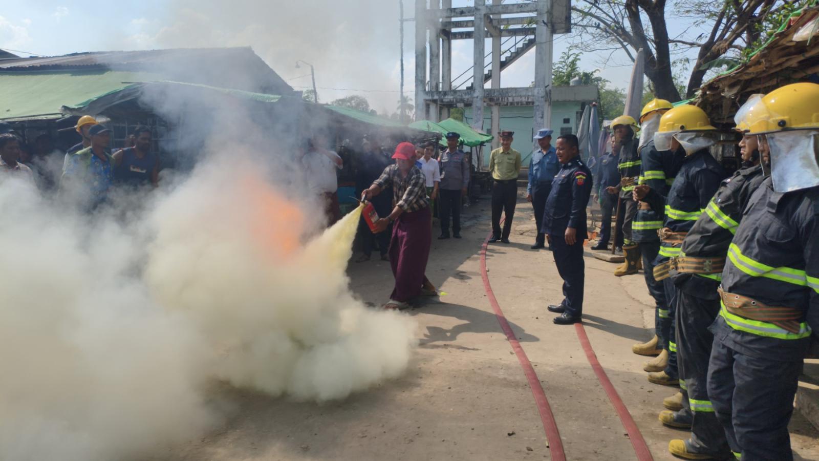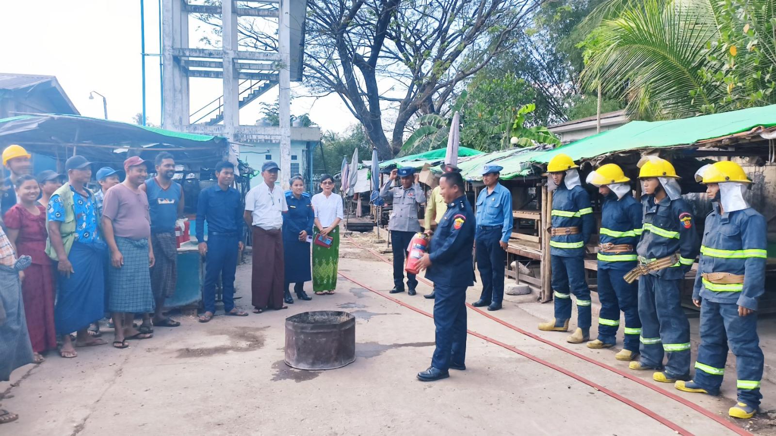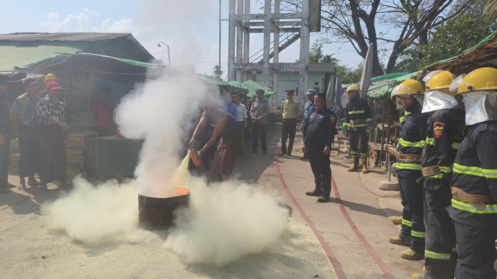 ဦးစွာ မြို့နယ်မီးသတ်ဦးစီးမှူး ဦးညီညီအောင်က ဈေးအတွင်း မီးဘေးအန္တရာယ် မဖြစ်ပေါ်စေရေးအတွက် ဈေးသူ၊ ဈေးသားများ စည်းကမ်းတကျ လိုက်နာရေးတို့ကို အသိပညာပေးဆွေးနွေးပြီး မီးသတ်တပ်ဖွဲ့ဝင်များက မီးသတ်ဆေးဘူး အသုံးပြု၍ မီးငြှိမ်းသတ်နည်းများကို ရှင်းလင်းပြောကြားကာ ဈေးသူ၊ဈေးသားများအား လက်တွေ့မီးငြှိမ်းသတ်ခြင်းကို လေ့ကျင့်သရုပ်ပြသကြသည်။ ထို့နောက် မီးသတ်တပ်ဖွဲ့ဝင်များက မီးငြှိမ်းသတ်ယာဉ် အသုံးပြု၍ မီးငြှိမ်းသတ်ခြင်းအား သရုပ်ပြလေ့ကျင့်ခဲ့ကြောင်း သိရသည်။