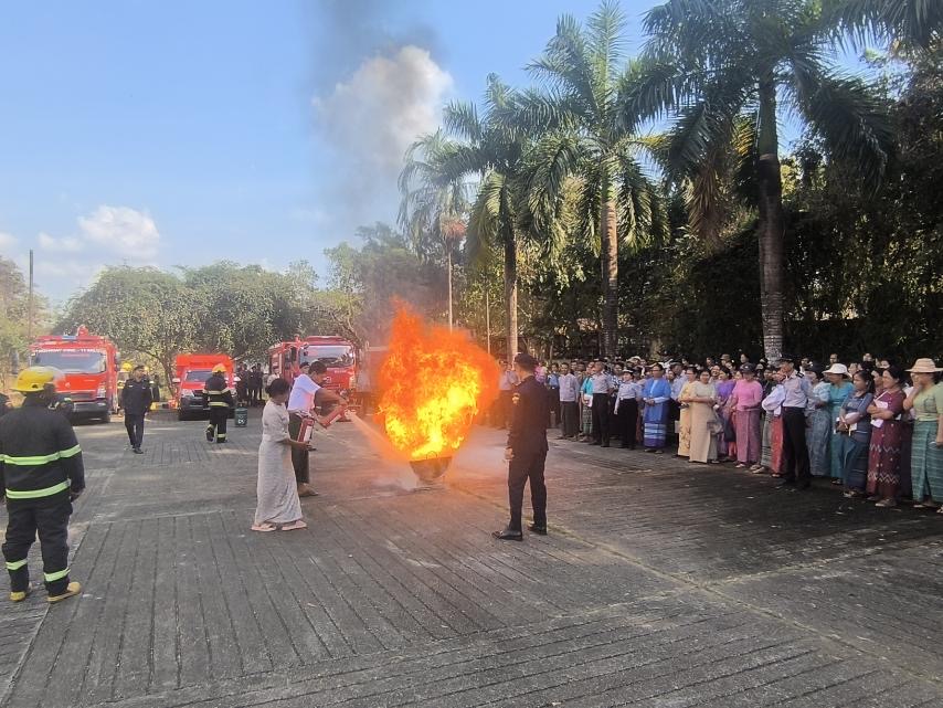 အဆိုပါ အခမ်းအနားတွင် ဒုတိယပါမောက္ခချုပ်(စီမံခန့်ခွဲရေး) ဒေါ်မူမူမြင့်က အဖွင့်အမှာစကားပြောကြားကာ ခရိုင်မီးသတ်ဦးစီးမှူး ဦးမြင့်ဦးက မီးဘေးလုံခြုံရေးအသိပညာပေးဆွေးနွေးပြီးနောက်၊ မြို့နယ်မီးသတ်ဦးစီးမှူး ဦးယုလွင်က မီးငြိမ်းသတ်ရေးနည်းစနစ်များ၊ ဂတ်စ်မီးငြိမ်းသတ်နည်း၊ နောက်ဆုံးပေါ်နည်းပညာသုံး ပိုလန်နိုင်ငံထုတ် LUF NANOမီးသတ်စွမ်းအားသရုပ်ပြခြင်းများ ဆောင်ရွက်ခဲ့သည်။