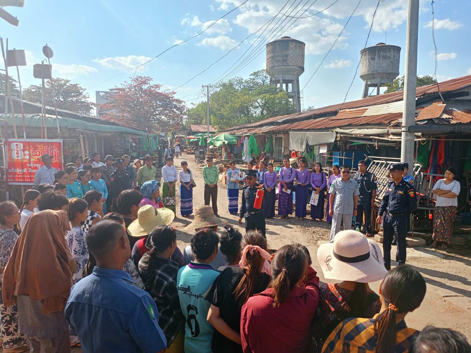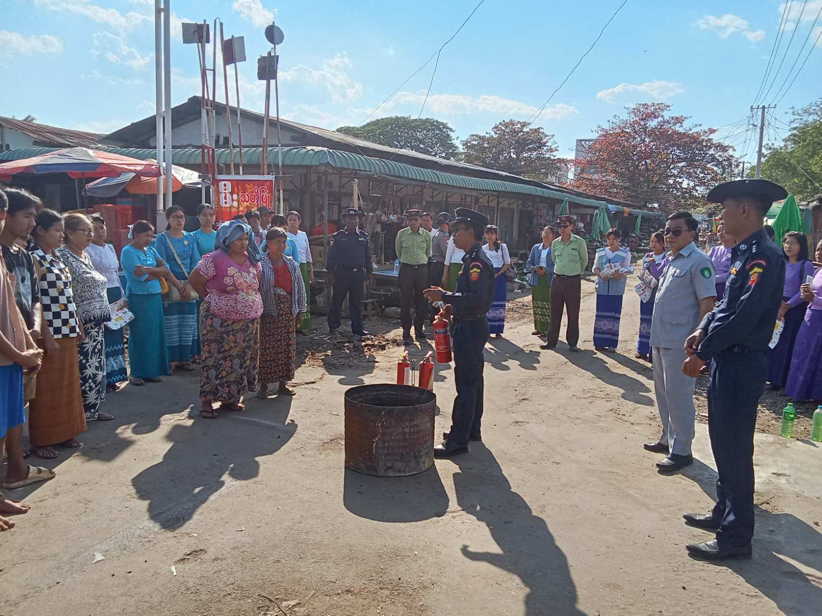 ရှေးဦးစွာ ခရိုင်မီးသတ်ဦးစီးမှူး ဦးအောင်ခင်ဆင့်နှင့် မြို့နယ်မီးသတ်ဦးစီးမှူး ဦးသူရလင်းတို့က ပူပြင်းခြောက်သွေ့၍ ပွင့်လင်းရာသီရောက်ရှိလာပြီဖြစ်သဖြင့် ခရိုင်/ မြို့နယ် မြို့မဈေးအတွင်း မီးဘေးအန္တရာယ်မဖြစ်ပေါ်စေရေးအတွက် ဈေးသူဈေးသားများကို စည်းကမ်းတကျလိုက်နာစေရေး အသိပညာပေးဆွေးနွေးပြီး ခရိုင်မီးသတ်စခန်းမှ ဦးစီးအရာရှိ ဦးထွန်းထွန်းဇော်နှင့် မီးသတ်တပ်ဖွဲ့ဝင်များက မီးသတ်ဆေးဗူးအသုံးပြု၍ မီးငြိမ်းသတ်နည်းများကို ရှင်းလင်းပြောကြားကာ ဈေးသူ၊ ဈေးသားများအား လက်တွေ့မီးငြိမ်းသတ်ခြင်းကို လေ့ကျင့်သရုပ်ပြသသည်။