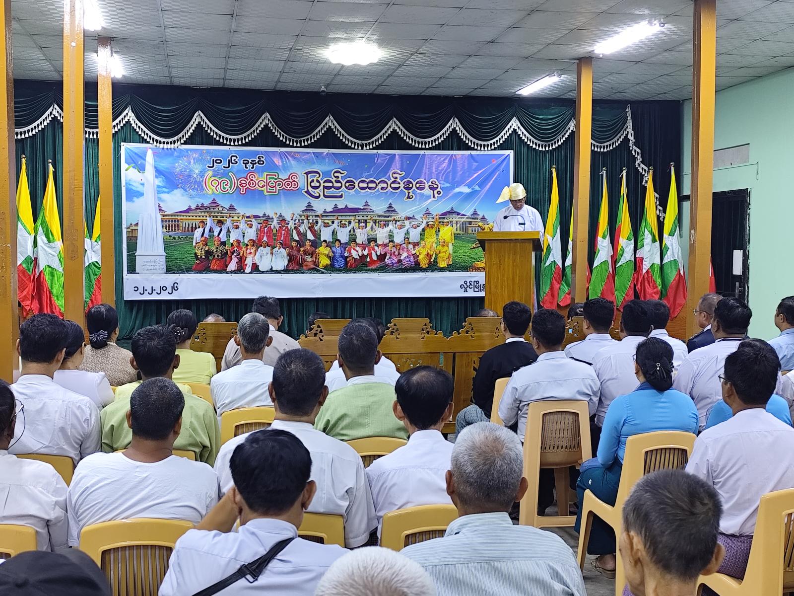 ရန်ကုန်တိုင်းဒေသကြီး၊ မရမ်းကုန်းခရိုင်၊ လှိုင်မြို့နယ်၌ (၇၉)နှစ်မြောက် ပြည်ထောင်စုနေ့ အထိမ်းအမှတ် နိုင်ငံတော်အလံအလေးပြုခြင်းနှင့် သဝဏ်လွှာဖတ်ကြားခြင်း အခမ်းအနားကို ယနေ့ နံနက် (၇) နာရီက မြို့နယ်အထွေထွေအုပ်ချုပ်ရေးဦးစီးဌာန အစည်းအဝေးခန်းမ၌ ပြုလုပ်ခဲ့ကြောင်း သိရသည်။