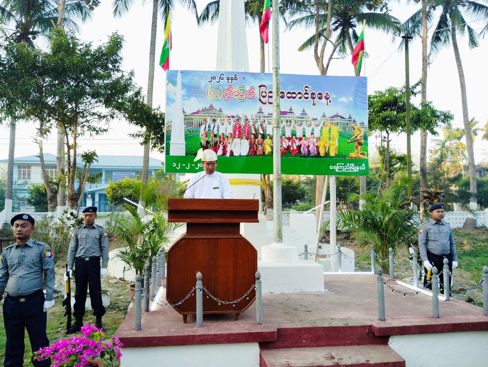 ဧရာဝတီတိုင်းဒေသကြီး ကျုံပျော်ခရိုင် ရေကြည်မြို့နယ်တွင် ယနေ့နံနက်(၇)နာရီအချိန်က (၇၉)နှစ်မြောက် ပြည်ထောင်စုနေ့ အခမ်းအနားကို မြို့နယ်အထွေထွေအုပ်ချုပ်ရေးဦးစီးဌာန ကျောက်တိုင်ကွင်း၌ ကျင်းပပြုလုပ်ခဲ့သည်။