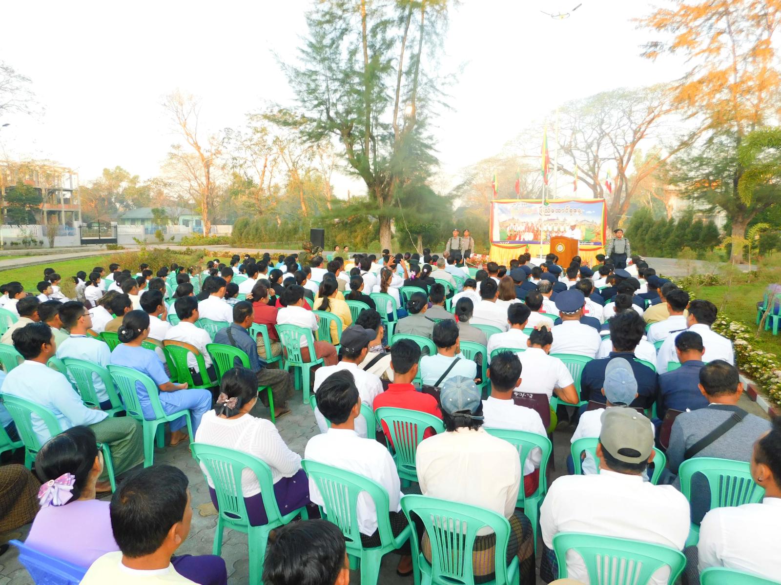 ဦးစွာ ပြည်ထောင်စုသမ္မတမြန်မာနိုင်ငံတော်အလံကိုမြို့နယ် ရဲတပ်ဖွဲ့ဂုဏ်ပြုတပ်ဖွဲ့နှင့်အတူ အခမ်းအနားသို့တက်ရောက်လာကြသည့် မြို့နယ်စီမံခန့်ခွဲရေးနှင့်အုပ်ချုပ်ရေးကော်မတီဥက္ကဋ္ဌ၊ မြို့နယ်စီမံခန့်ခွဲရေးနှင့်အုပ်ချုပ်ရေးကော်မတီအဖွဲ့ဝင်များ၊ မြို့နယ်အဆင့်ဌာနဆိုင်ရာတာဝန်ရှိသူများ၊ ဆရာ၊ဆရာမများနှင့် ကျောင်းသား၊ကျောင်းသူများ၊ မြို့နယ်ဗုဒ္ဓဘာသာကလျာဏယုဝအသင်း(YMBA) မှတာဝန်ရှိသူများ၊ မြို့နယ်အမျိုးသမီးရေးရာအဖွဲ့ဝင်များ၊ မြို့နယ်မိခင်နှင့်ကလေးစောင့်ရှောက်ရေးအသင်းအဖွဲ့ဝင်များ၊ မြို့နယ်ကြက်ခြေနီတပ်ဖွဲ့ဝင်များနှင့် ရပ်ကွက်နေပြည်သူက အလေးပြုခဲ့ကြသည်။