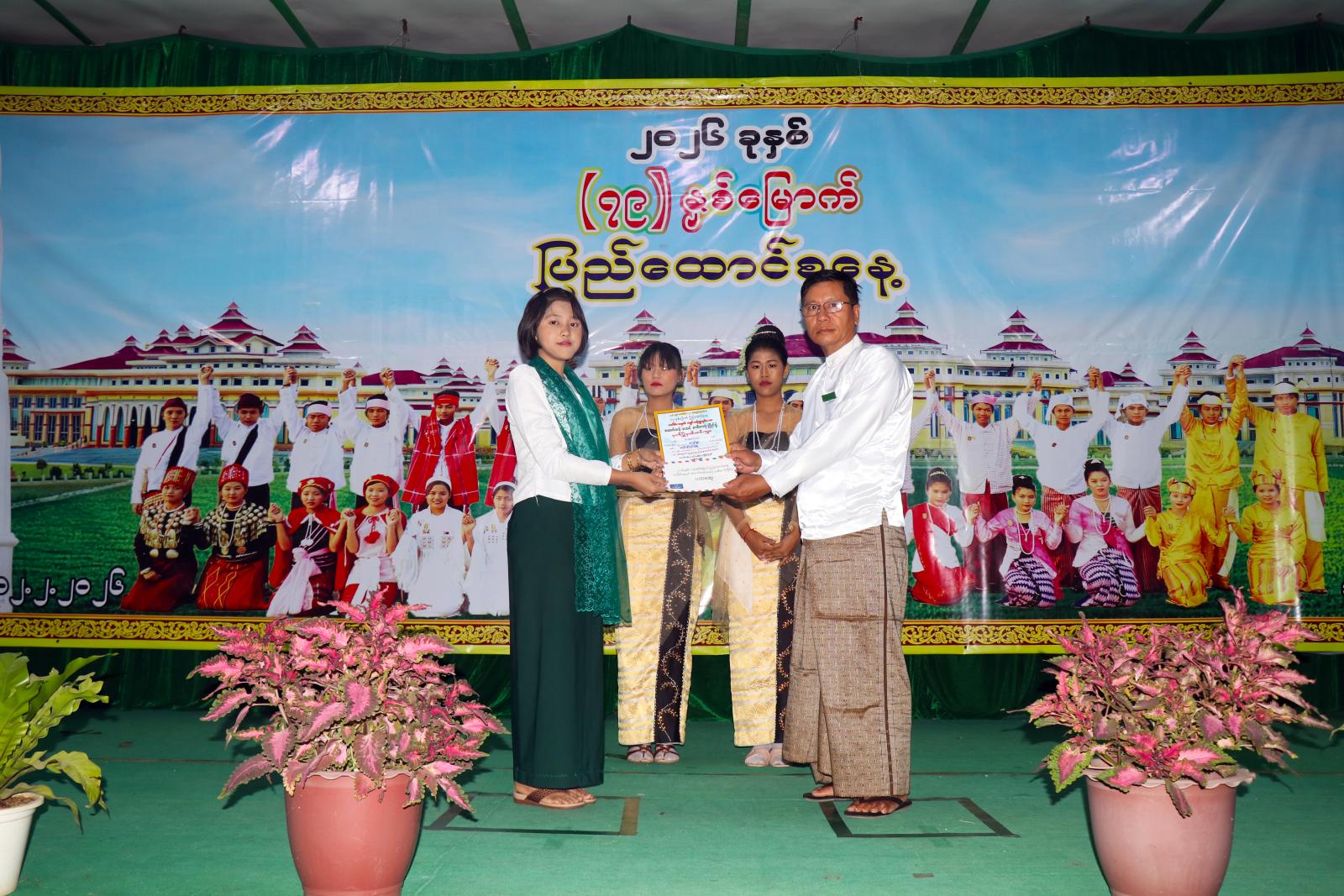 ဆက်လက်ပြီး အ.ထ.က(၁)ကျောင်းသူလေးများက စည်းလုံးစို့လေ သွေးချင်းတို့ရဲ့ပြည်သီချင်းဖြင့် ကပြဖျော်ဖြေရာ မြို့နယ်စီမံခန့်ခွဲရေးနှင့်အုပ်ချုပ်ရေးကော်မတီဝင် ဗိုလ်မှူးတေဇာမြင့်က ဂုဏ်ပြုဆုငွေချီးမြှင့်သည်။ ထို့နောက် (၇၉)နှစ်မြောက် ပြည်ထောင်စုနေ့အထိမ်းအမှတ်ကျင်းပပြုလုပ်သော အထက်တန်း၊ အလယ်တန်းနှင့် မူလတန်းအဆင့်စာစီစာကုံး၊ ပန်းချီနှင့်ကဗျာရွတ်ဆိုပြိုင်ပွဲတို့၌ ဆုရရှိသူများအား ဂုဏ်ပြုမှတ်တမ်းနှင့်ဆုချီးမြှင့်ငွေများကို မြို့နယ်စီမံခန့်ခွဲရေးနှင့်အုပ်ချုပ်ရေးကော်မတီဥက္ကဋ္ဌ ဦးမျိုးသက်ကျော်နှင့်ကော်မတီဝင်များ၊ မြို့နယ်အဆင့်ဌာနဆိုင်ရာများနှင့်တာဝန်ရှိသူများက ပေးအပ်ချီးမြင့်သည်။ ဆက်လက်ပြီး အ.ထ.က(၂) ကျောင်းသူလေးများက ထာဝရမြန်မာသီချင်းဖြင့် ကပြဖျော်ဖြေရာ မြို့နယ်စီမံခန့်ခွဲရေးနှင့်အုပ်ချုပ်ရေးကော်မတီဝင်ဦးစိုးဝင်းအောင်က ဂုဏ်ပြုဆုငွေချီးမြှင့်ခဲ့ပြီး တက်ရောက်လာသူများ၊ ဆုရရှိသူများနှင့် တေးသီချင်းများဖြင့် ကပြဖျော်ဖြေသော ကျောင်းသူလေးများ မှတ်တမ်းတင်ဓာတ်ပုံရိုက်ခဲ့ကြကြောင်း သိရသည်။
