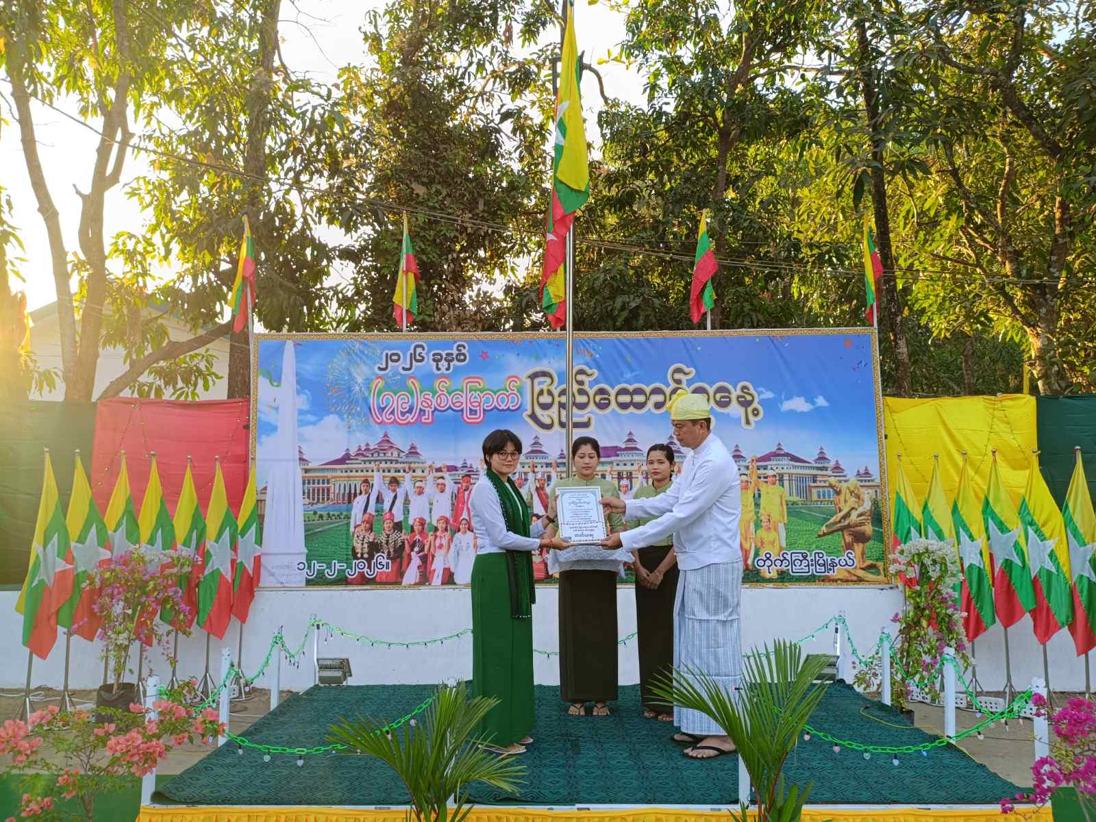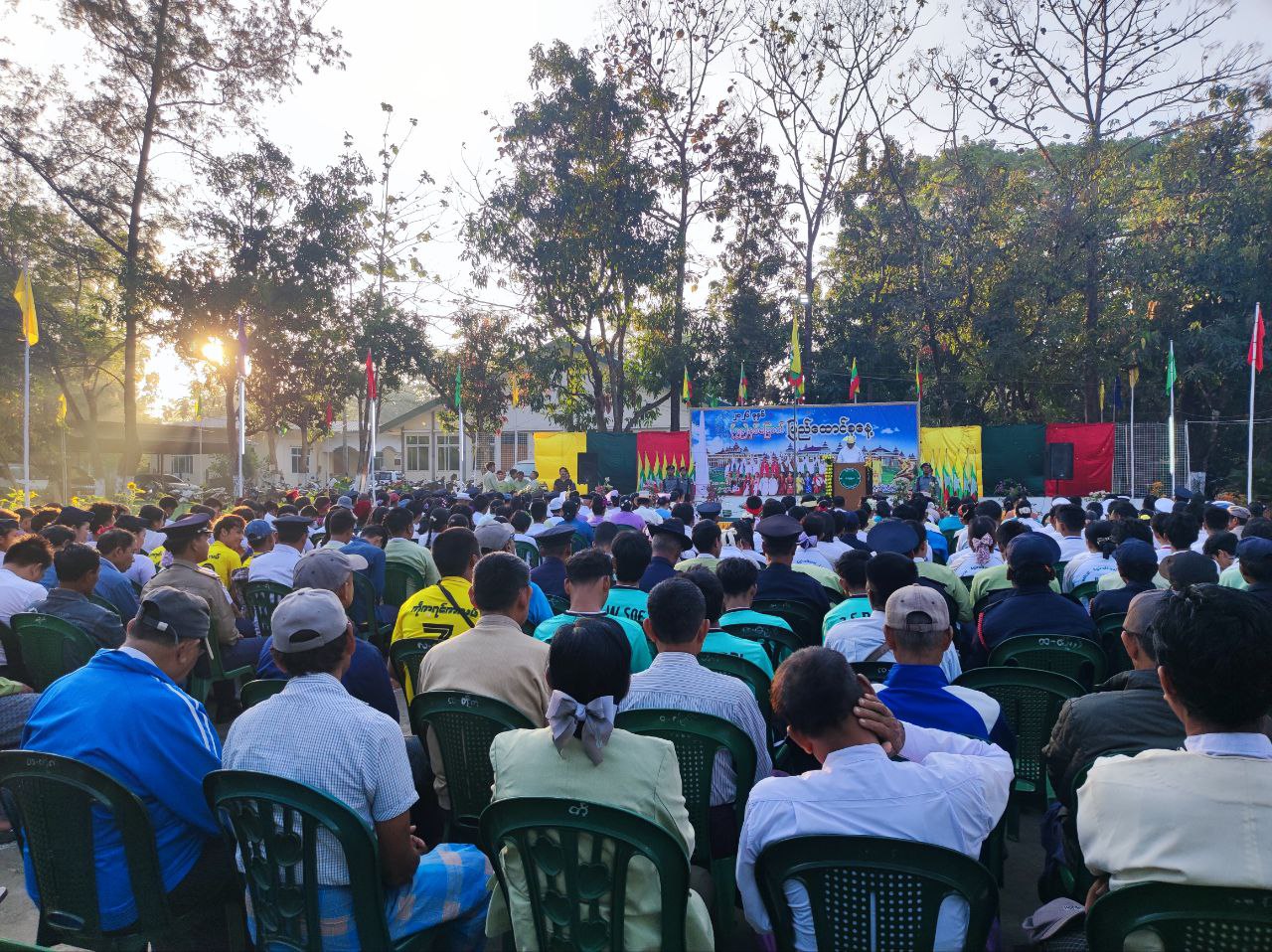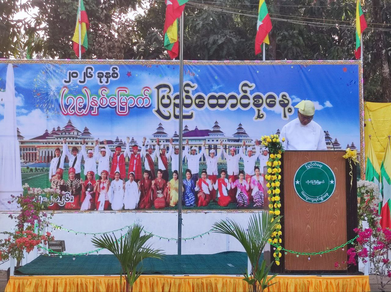 ဦးစွာ ပြည်ထောင်စုသမ္မတမြန်မာနိုင်ငံတော်အလံကို မြန်မာနိုင်ငံ ရဲတပ်ဖွဲ့ဂုဏ်ပြုတပ်ဖွဲ့နှင့်အတူ မြို့နယ်စီမံခန့်ခွဲရေးနှင့်အုပ်ချုပ်ရေးကော်မတီဥက္ကဋ္ဌ ဦးခင်မောင်စိုးနှင့် တက်ရောက်လာကြသူများက အလေးပြုခဲ့ကြပြီး ပြည်ထောင်စုသမ္မတမြန်မာနိုင်ငံတော်ယာယီသမ္မတ နိုင်ငံတော်လုံခြုံရေးနှင့် အေးချမ်းသာယာရေးကော်မရှင်ဥက္ကဋ္ဌ ဗိုလ်ချုပ်မှူးကြီး သတိုးမဟာသရေစည်သူ သတိုးသီရိသုဓမ္မ မင်းအောင်လှိုင်ထံမှ (၇၉) နှစ်မြောက် ပြည်ထောင်စုနေ့ အခမ်းအနားသို့ ပေးပို့လာသည့် သဝဏ်လွှာကို မြို့နယ်စီမံခန့်ခွဲရေးနှင့်အုပ်ချုပ်ရေးကော်မတီဥက္ကဋ္ဌ ဦးခင်မောင်စိုးက ဖတ်ကြားသည်။