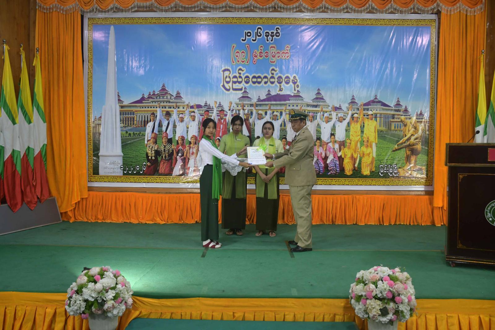 ထို့နောက် ၂၀၂၅၆ ခုနှစ် (၇၉)နှစ်မြောက် ပြည်ထောင်စုနေ့ အထိမ်းအမှတ်အဖြစ် ကျင်းပပြုလုပ်သော အခြေခံပညာမူလတန်းအဆင့်၊ အလယ်တန်းအဆင့်နှင့် အထက်တန်းအဆင့် စာစီစာကုံးပြိုင်ပွဲများတွင် ဆုရရှိသူများအား ခရိုင်စီမံခန့်ခွဲရေးနှင့်အုပ်ချုပ်ရေးကော်မတီအဖွဲ့ဝင်များ၊ မြို့နယ်စီမံခန့်ခွဲရေးနှင့်အုပ်ချုပ်ရေးကော်မတီဥက္ကဋ္ဌ ဦးစိုးထွဋ်နှင့်အဖွဲ့ဝင်များက အသီးသီးဆုချီးမြှင့်ပေးခဲ့ကြောင်း သိရသည်။