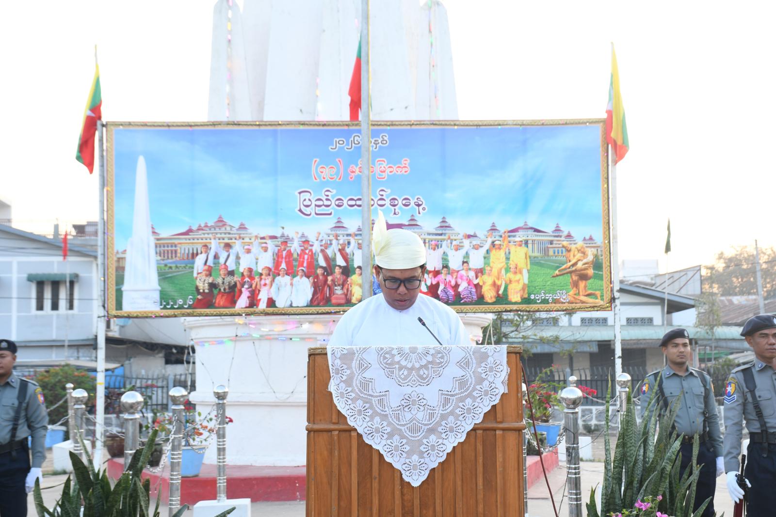အခမ်းအနားတွင် မြန်မာနိုင်ငံရဲတပ်ဖွဲ၏ ဂုဏ်ပြုတပ်ဖွဲ့ကဦးဆောင်၍ နိုင်ငံတော်အလံအလေးပြုခြင်းကိုဆောင်ရွက်ကြပြီး၊ မြိုနယ်စီမံခန့်ခွဲရေးနှင့်အုပ်ချုပ်ရေးကော်မတီဥက္ကဋ္ဌ ဦးအာကာစိုးက ပြည်ထောင်စုသမ္မတမြန်မာနိုင်ငံတော် ယာယီသမ္မတ၊ နိုင်ငံတော်လုံခြုံရေးနှင့် အေးချမ်းသာယာရေးကော်မရှင်ဥက္ကဋ္ဌ၊ ဗိုလ်ချုပ်မှူးကြီး သတိုးမဟာသရေစည်သူ သတိုးသီရိသုဓမ္မ မင်းအောင်လှိုင်ထံမှ ၂၀၂၆ ခုနှစ်၊ (၇၉)နှစ်မြောက် ပြည်ထောင်စုနေ့အခမ်းအနားသို့ ပေးပိုသည့် သဝဏ်လွှာကိုဖတ်ကြားသည်။