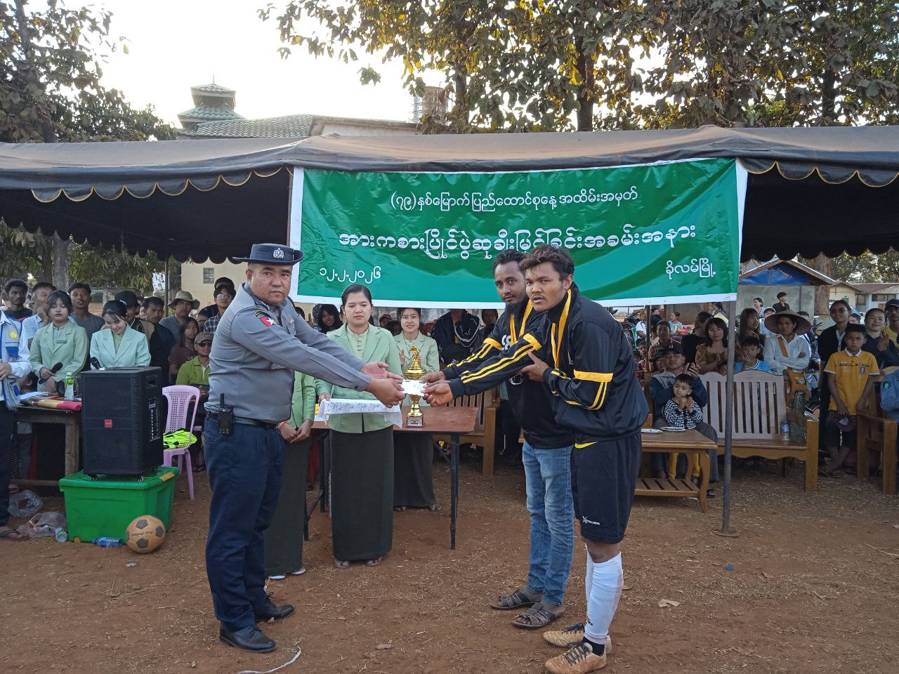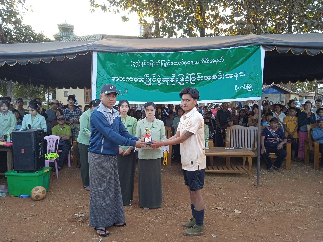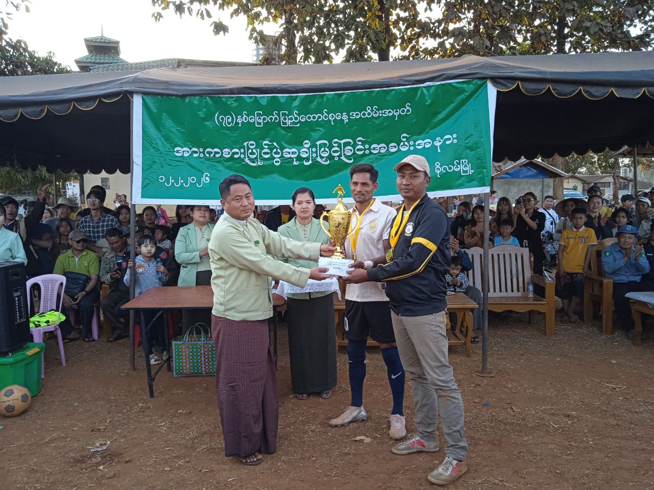 ယင်းနောက် ဆုချီးမြှင့်ပွဲအခမ်းအနားအား ဆက်လက်ကျင်းပရာ ပွဲစဉ်တစ်လျှောက်အကောင်းဆုံး ဂိုးသမားဆုကို အမှတ် (၁) ရပ်ကွက်အသင်းမှ ကျောနံပါတ် (၁)နှင့် နောက်တန်းအကောင်းဆုံးဆုကို အမှတ် (၃) ရပ်ကွက်အသင်းမှ ကျောနံပါတ် (၃၀) တို့အား လူဝင်မှုကြီးကြပ်ရေးနှင့်ပြည်သူအင်အားဦးစီး ဌာနမှလည်းကောင်း၊ ပွဲစဉ်တစ်လျှောက် အလယ်တန်းအကောင်းဆုံးဆုကို အမှတ် (၅၊ ၆) ရပ်ကွက်အသင်းမှ ကျောနံပါတ် (၁၁) အား ကုတင် (၁၀၀) ပြည်သူ့ဆေးရုံးမှလည်းကောင်း၊ ပွဲစဉ်တစ်လျှောက် ရှေ့တန်းအကောင်းဆုံးဆုကို အမှတ် (၅၊ ၆) ရပ်ကွက်အသင်းမှ ကျောနံပါတ်(၁၀)အား မီးသတ်ဦးစီးဌာနမှလည်းကောင်း၊ ပွဲစဉ်တစ်လျှောက်အကောင်းဆုံး အားကစားသမားဆုကို အမှတ် (၁) ရပ်ကွက်အသင်းမှ ကျောနံပါတ် (၈) အား သစ်တောဦးစီးဌာနမှလည်းကောင်း၊ တတိယဆုရရှိသော အမှတ် (၃) အသင်းအား စည်ပင်သာယာရေးဦးစီးဌာန၊ မြို့ဦးစီးမှူးမှလည်းကောင်း၊ ဒုတိယဆုရရှိသည့် အမှတ်(၅၊၆)ရပ်ကွက် အသင်းအား မြန်မာနိုင်ငံရဲတပ်ဖွဲ့၊ စခန်းမှူးမှလည်းကောင်း၊ ပထမဆုရရှိသည့် အမှတ် (၁)ရပ်ကွက် အသင်းအား မြို့စီမံခန့်ခွဲရေးနှင့်အုပ်ချုပ်မှုကော်မတီ ဥက္ကဋ္ဌ ဦးအောင်းမင်းစိုးတို့က လည်ဆွဲဆုတံဆိပ်၊ ငွေသားဆုနှင့် ဆုကလပ်များ အသီးသီးပေးအပ်ချီးမြှင့်ခဲ့ကြောင်း သိရှိရသည်။
