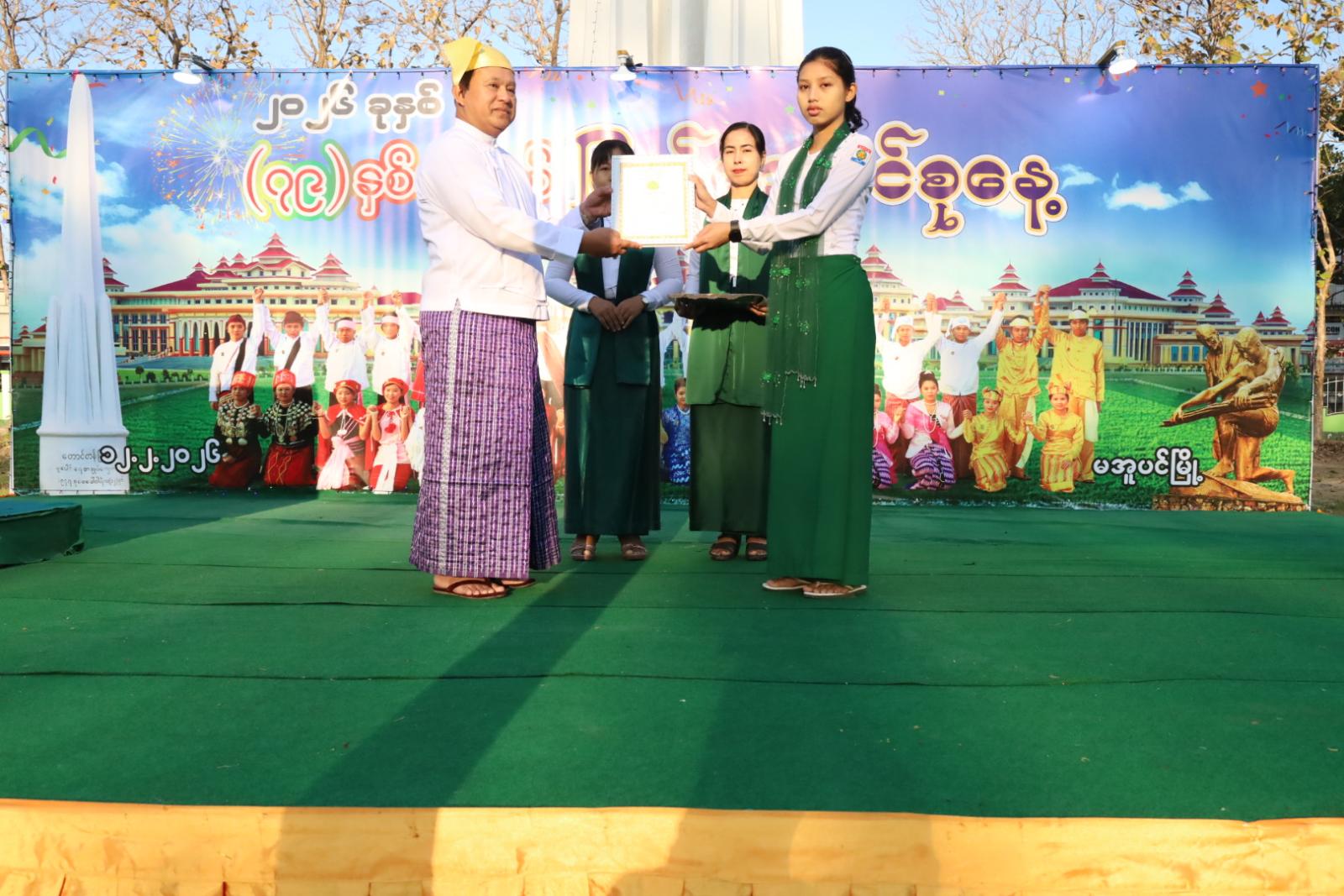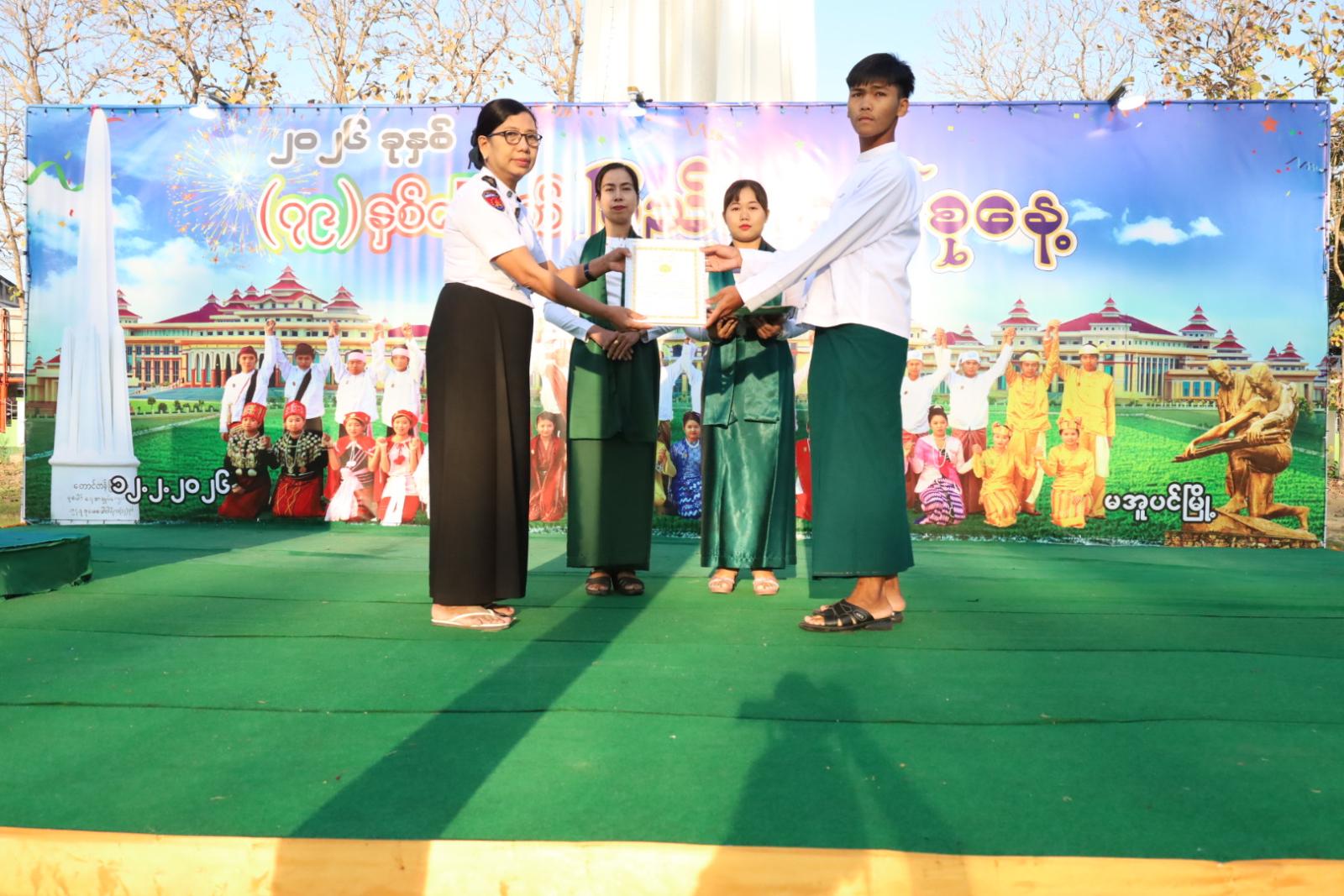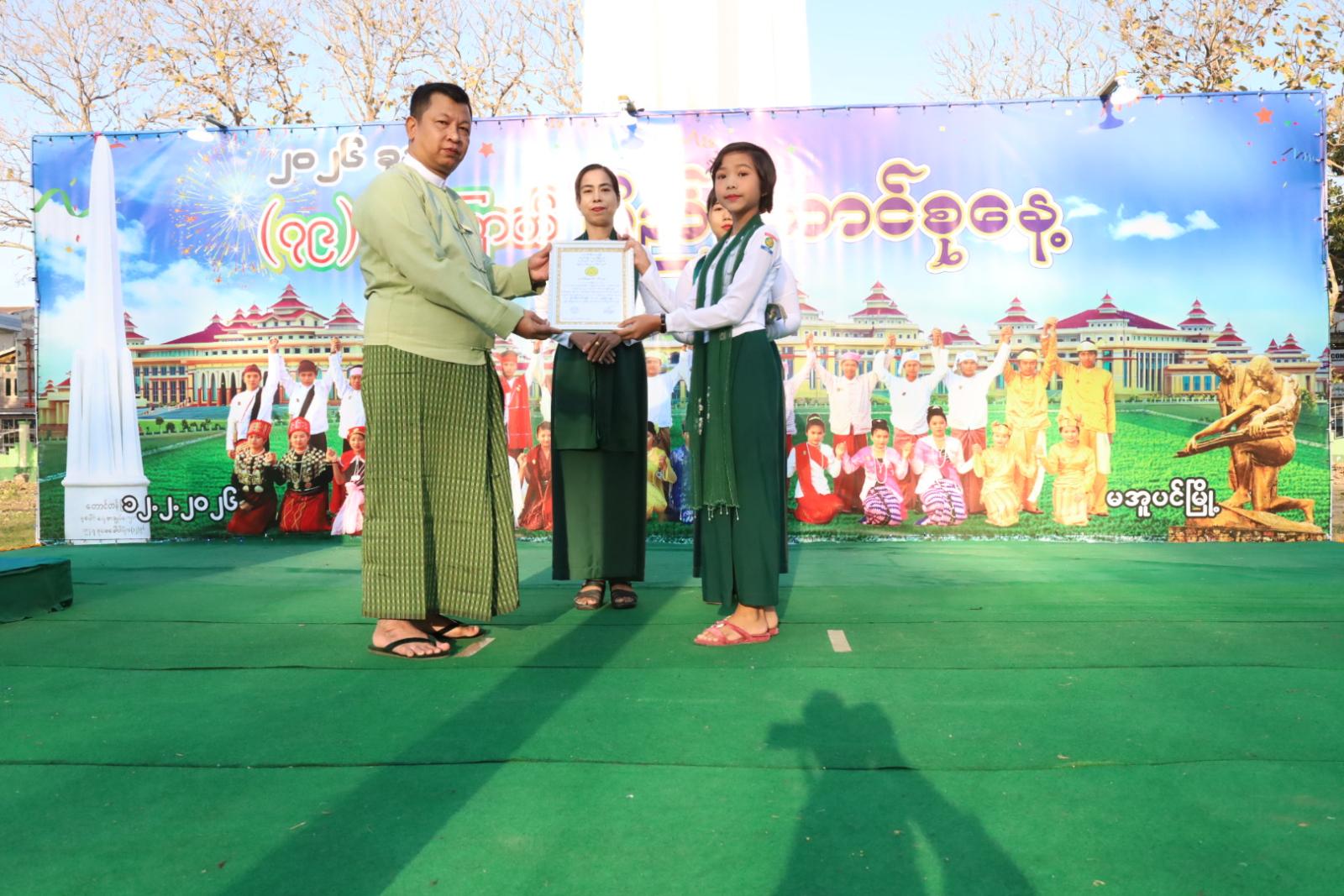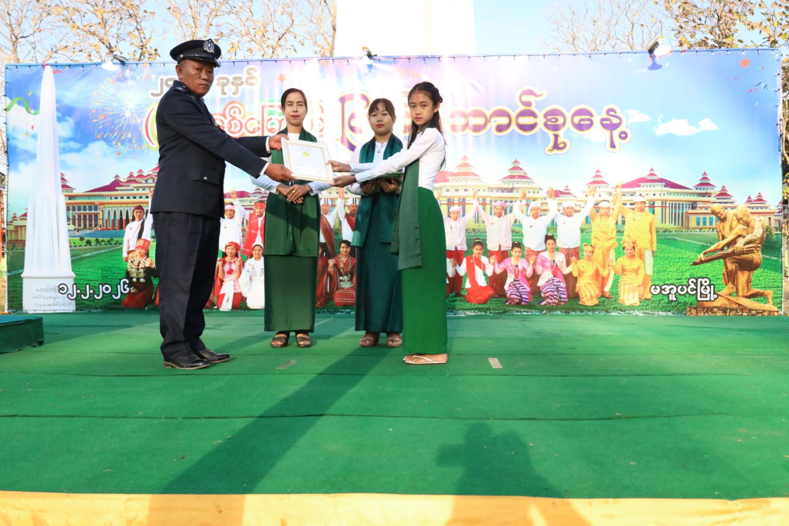 ရှေ့ဦးစွာ ပြည်ထောင်စုသမ္မတမြန်မာနိုင်ငံတော်အလံအားအလေးပြု၍ ပြည်ထောင်စုသမ္မတ မြန်မာနိုင်ငံတော်၊ ယာယီသမ္မတ၊ နိုင်ငံတော်လုံခြုံရေးနှင့်အေးချမ်းသာယာရေးကော်မရှင်ဥက္ကဋ္ဌ ဗိုလ်ချုပ်မှူးကြီး သတိုးမဟာသရေစည်သူ သတိုးသီရိသုဓမ္မမင်းအောင်လှိုင်ထံမှ (၇၉)နှစ်မြောက် ပြည်ထောင်စုနေ့အခမ်းအနားသို့ပေးပို့သည့် သဝဏ်လွှာအား ခရိုင်စီမံခန့်ခွဲရေးနှင့်အုပ်ချုပ်ရေးကော်မတီဥက္ကဋ္ဌ ဦးမြင့်နိုင်ကဖတ်ကြားခဲ့သည်။ ဆက်လက်၍ (၇၉) နှစ်မြောက် ပြည်ထောင်စုနေ့အထိမ်းအမှတ် အခြေခံပညာအထက်တန်းအဆင့်၊ အလယ်တန်းအဆင့်၊ မူလတန်းအဆင့် စာစီစာကုံးပြိုင်ပွဲနှင့် ကဗျာပြိုင်ပွဲတို့တွင် ဆုရရှိကြသည့် ကျောင်းသား၊ ကျောင်းသူများကို တာဝန်ရှိသူများက ဂုဏ်ပြုဆုများပေးအပ်ချီးမြှင့်ခဲ့ကြသည်။