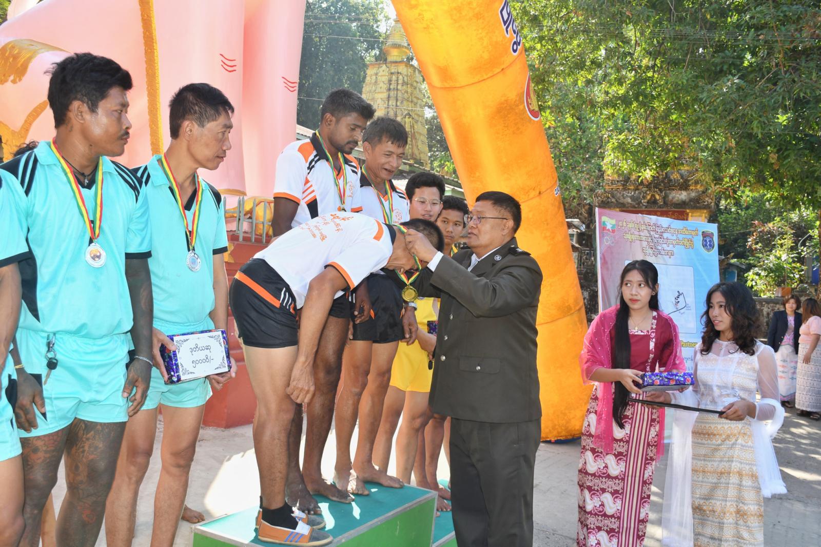ယင်းနောက် ဆုချီးမြှင့်ပွဲကိုကျင်းပရာ ရိုးရာခြင်းလုံးအမှတ်ခတ်ပြိုင်ပွဲ၌ အနိုင်ရဗိုလ်စွဲခဲ့သည့် အသင်းအား သထုံခရိုင် စီမံခန့်ခွဲရေးနှင့်အုပ်ချုပ်ရေးကော်မတီဥက္ကဋ္ဌ ဦးစိုးအောင်က ဂုဏ်ပြုဆုနှင့် ဆုဖလားကို ချီးမြှင့်ပေးပြီး ခရိုင်စီမံခန့်ခွဲရေးနှင့်အုပ်ချုပ်ရေးကော်မတီဝင်များနှင့် တာဝန်ရှိသူတို့က ဒုတိယဆု၊ တတိယဆိုရရှိကြသည့် အသင်းတို့အား တစ်ဦးချင်းဂုဏ်ပြုဆုများကိုလည်းကောင်း သုံးမျိုးစုံအားကစားပြိုင်ပွဲ၌ ပထမဆု ဆွတ်ခူးရရှိသူအား ခရိုင်ရဲတပ်ဖွဲ့မှူး ဒုတိယရဲမှူး ကြီးမြင့်နိုင်က ဂုဏ်ပြုဆုနှင့် ဆုဖလား ချီးမြှင့်ပေးပြီး တာဝန်ရှိသူတို့က ဒုတိယ၊ တတိယနှင့် နှစ်သိမ့်ဆုရရှိကြသူတို့အားလည်းကောင်း အသီးသီးချီးမြှင့်ပေးခဲ့ကြသည်။
