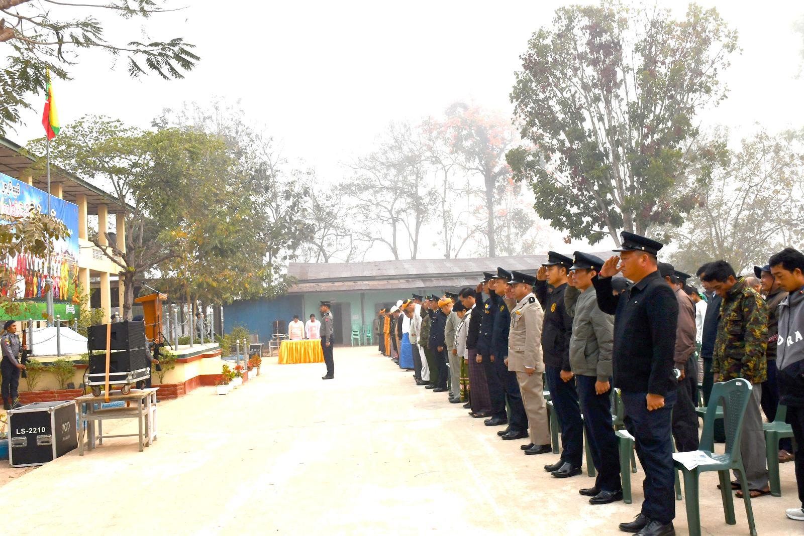 ဦးစွာ မြို့နယ်ရဲတပ်ဖွဲ့မှ ဦးဆောင်၍ မြန်မာနိုင်ငံတော်အလံအား အခမ်းအနားတက် ရောက်လာသူများက အလေးပြုကြပြီး ပြည်ထောင်စုသမ္မတမြန်မာနိုင်ငံတော်ယာယီသမ္မတ နိုင်ငံတော်လုံခြုံရေးနှင့် အေးချမ်းသာယာရေးကော်မရှင်ဥက္ကဌ ဗိုလ်ချုပ်မှူးကြီး သတိုးမဟာသရေစည်သူ သတိုးသီရိသုဓမ္မ မင်းအောင်လှိုင်ထံမှ ပေးပို့သော (၇၉) နှစ်မြောက် ပြည်ထောင်စုနေ့သဝဏ်လွှာအား ခရိုင်စီမံခံခွဲရေးနှင့်အုပ်ချုပ်ရေးကော်မတီဥက္ကဋ္ဌ ဦးညီညီထွေးက ဖတ်ကြားသည်။