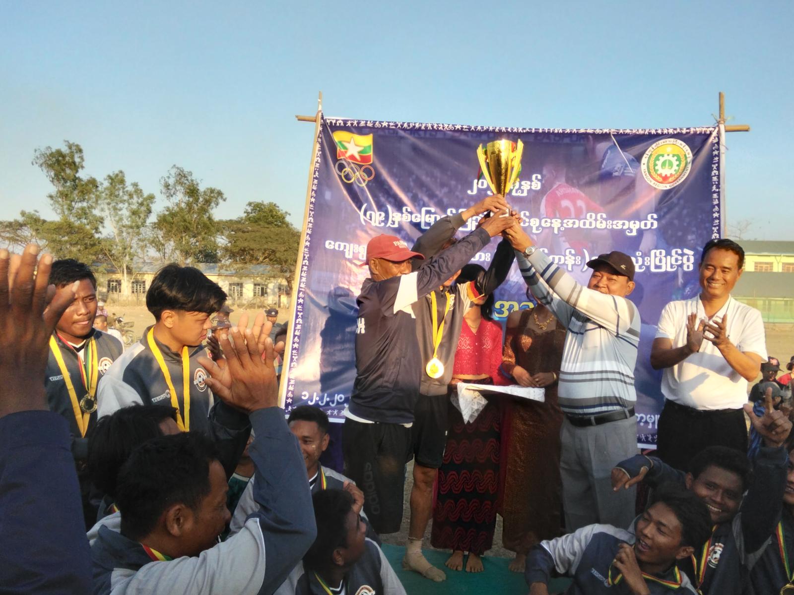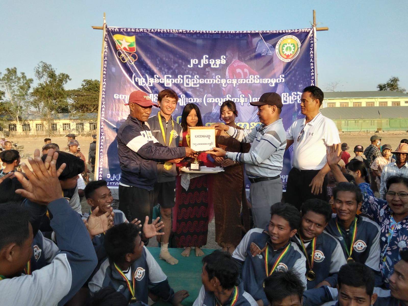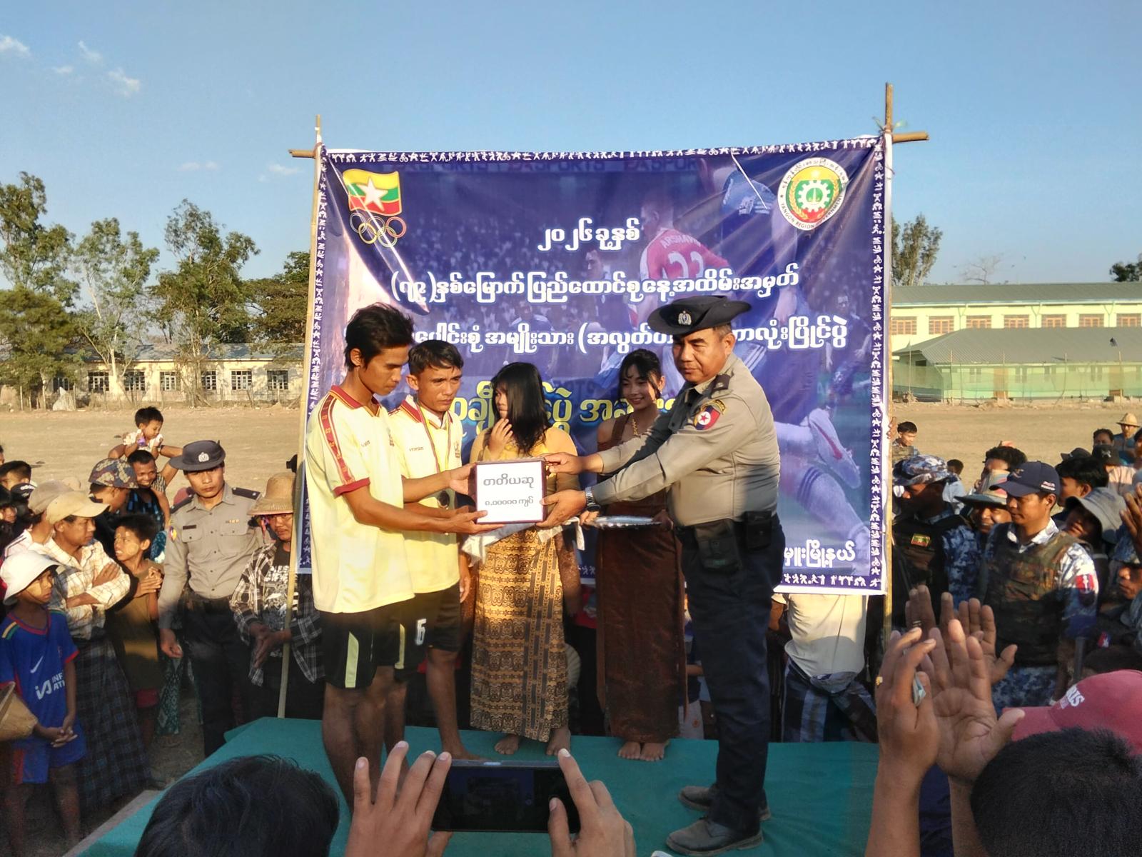 ထို့နောက် ဆုချီးမြှင့်ပွဲအခမ်းအနားကို ဆက်လက်ကျင်းပရာပြိုင်ပွဲတစ်လျှောက်လုံး အကောင်းဆုံး ဂိုးသမားဆု၊ နောက်တန်းဆု၊ အလယ်တန်းဆု၊ ရှေ့တန်းဆုနှင့်တတိယဆု၊ ဒုတိယဆု၊ ပထမဆုတို့ကို မြို့နယ်စီမံခန့်ခွဲရေးနှင့်အုပ်ချုပ်ရေးကော်မတီဥက္ကဋ္ဌ ဦးမျိုးမင်းနှင့်အဖွဲ့ဝင်များ၊ ဌာနဆိုင်ရာများနှင့် တာဝန်ရှိသူများက ဆုတံဆိပ်၊ ဆုငွေနှင့်ဆုဖလားတို့အားချီးမြှင့်ပေးခဲ့ကြကြောင်းသိရသည်။