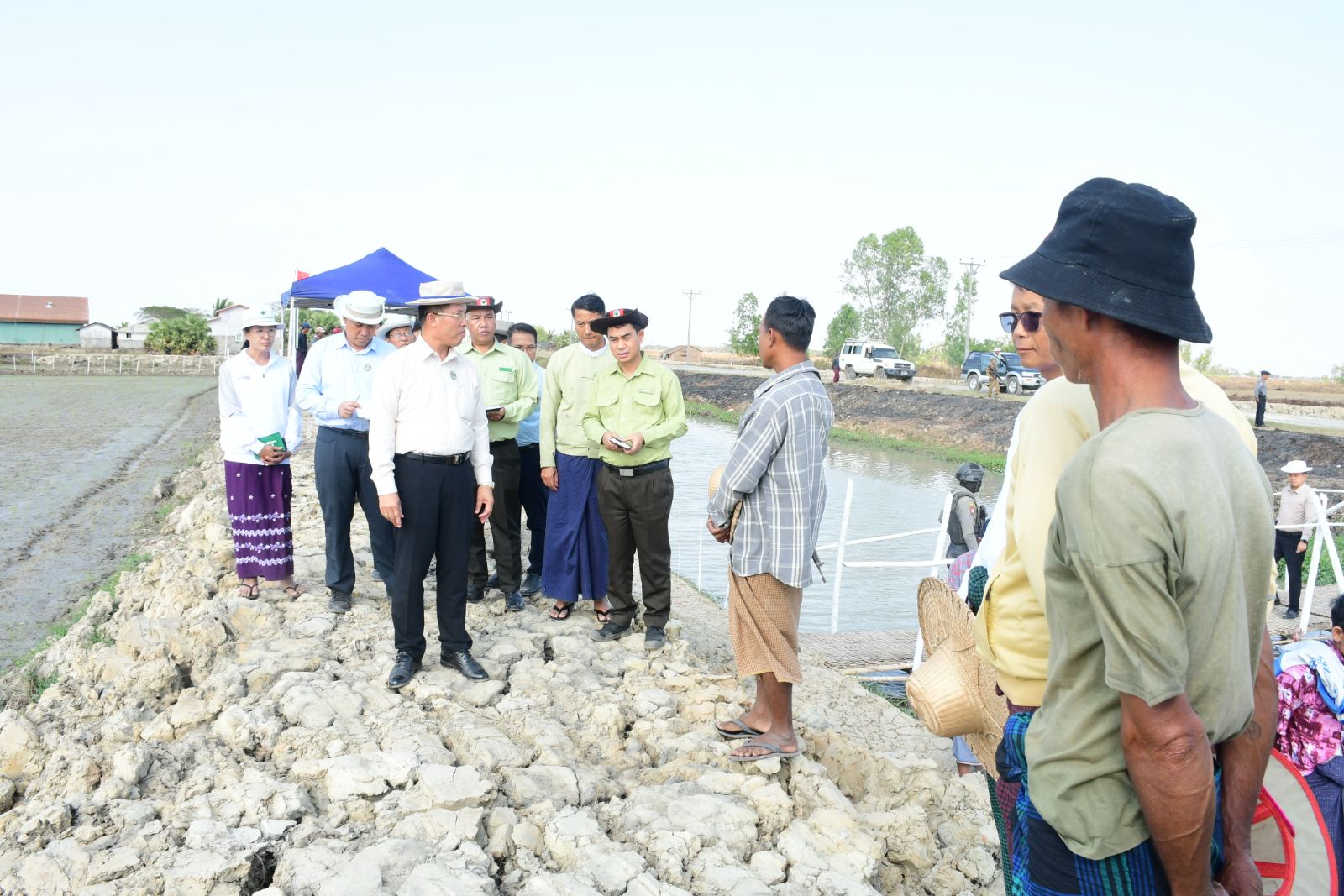 ဆက်လက်၍ ဖျာပုံမြို့နယ်၊ ဝါးချောင်းကျေးရွာ၂၀၂၅-၂၀၂၆ ခုနှစ်၊ နွေစပါးဆားငန်ခံစံပြကွက် (၁၅) ဧက စိုက်ခင်းအား ကြည့်ရှုအားပေးပြီး ရေချိုရရှိအောင် တူးဖော်ပေးထားပြီးဖြစ်သဖြင့် ရေငန်ဒဏ်ခံစပါးမျိုးများဖြင့် ဖြစ်ထွန်းအောင်မြင်အောင် ဆောင်ရွက်ရန်၊ ရေငန်ဝင်ရောက်မှုနည်းပါးစေရေး ရေငန်တားလုပ်ငန်းများဆောင်ရွက်ပေးရန်၊ ရေငန်တားရေချိုထိန်း ရေတံခါး ဝါးချောင်းရေတံခါးနဲ့ ဖလက်ရေတံခါးကို ပြုပြင်ရန်နှင့် လိုအပ်သည်များမှာကြားခဲ့ကြောင်းသိရသည်။ ယင်းနောက် တိုင်းဒေသကြီးဝန်ကြီးချုပ်နှင့်အဖွဲ့သည် ဖျာပုံမြို့နယ်၊ ငုတောကျေးရွာ ၂၀၂၅-၂၀၂၆ ခုနှစ်၊ နွေစပါးရက် (၉၀) ၁၅ဧကစံပြကွက်အား ကြည့်ရှုအားပေးပြီး ပန်းတိုင်အထွက်နှုန်းရရှိရေး၊ သဘာဝမြေဩဇာ၊ ဓာတ်မြေဩဇာအချိုးကျ ထည့်သွင်းသုံးစွဲရေးတို့ကို မှာကြားခဲ့သည်။