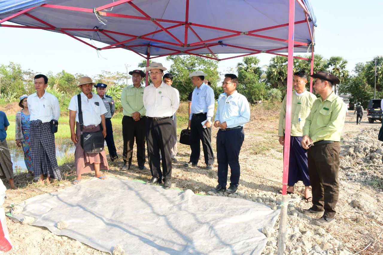 ဆက်လက်၍ တိုင်းဒေသကြီးဝန်ကြီးချုပ်နှင့်အဖွဲ့သည် ဖျာပုံမြို့နယ်၊ ကြက်ဖမွေးဇောင်းကျွန်းပတ်တာ ကျုံကဒွန်း-အမာ လက်ယာမြောင်း အပိုင်း (၂) တူးဖော်ခြင်းလုပ်ငန်း အလျား ၁၂၀၀၀ ပေ၊ ထိပ်ဝအကျယ်၂၄ ပေ၊ အောက်ခြေအကျယ် ၁၂ ပေ၊ ပျှမ်းမျှအနက် ၆ ပေ တူးဖော်နေမှုအား ကြည့်ရှုစစ်ဆေးခဲ့ပြီး သတ်မှတ်ကာလအတွင်း ပြီးစီးစေရေးမှာကြားခဲ့သည်။