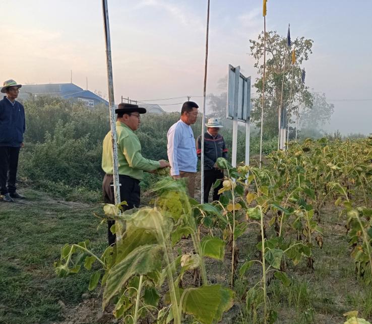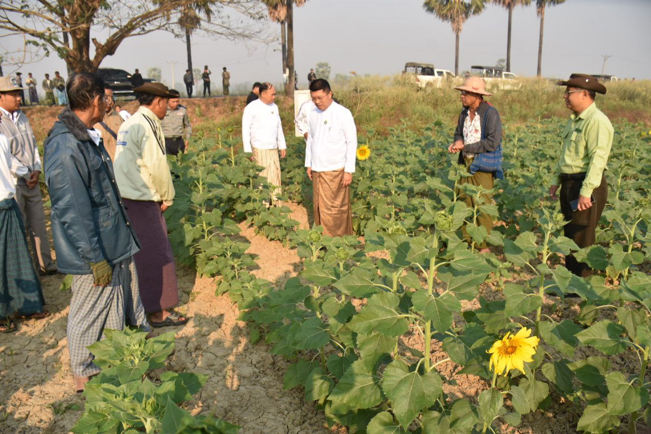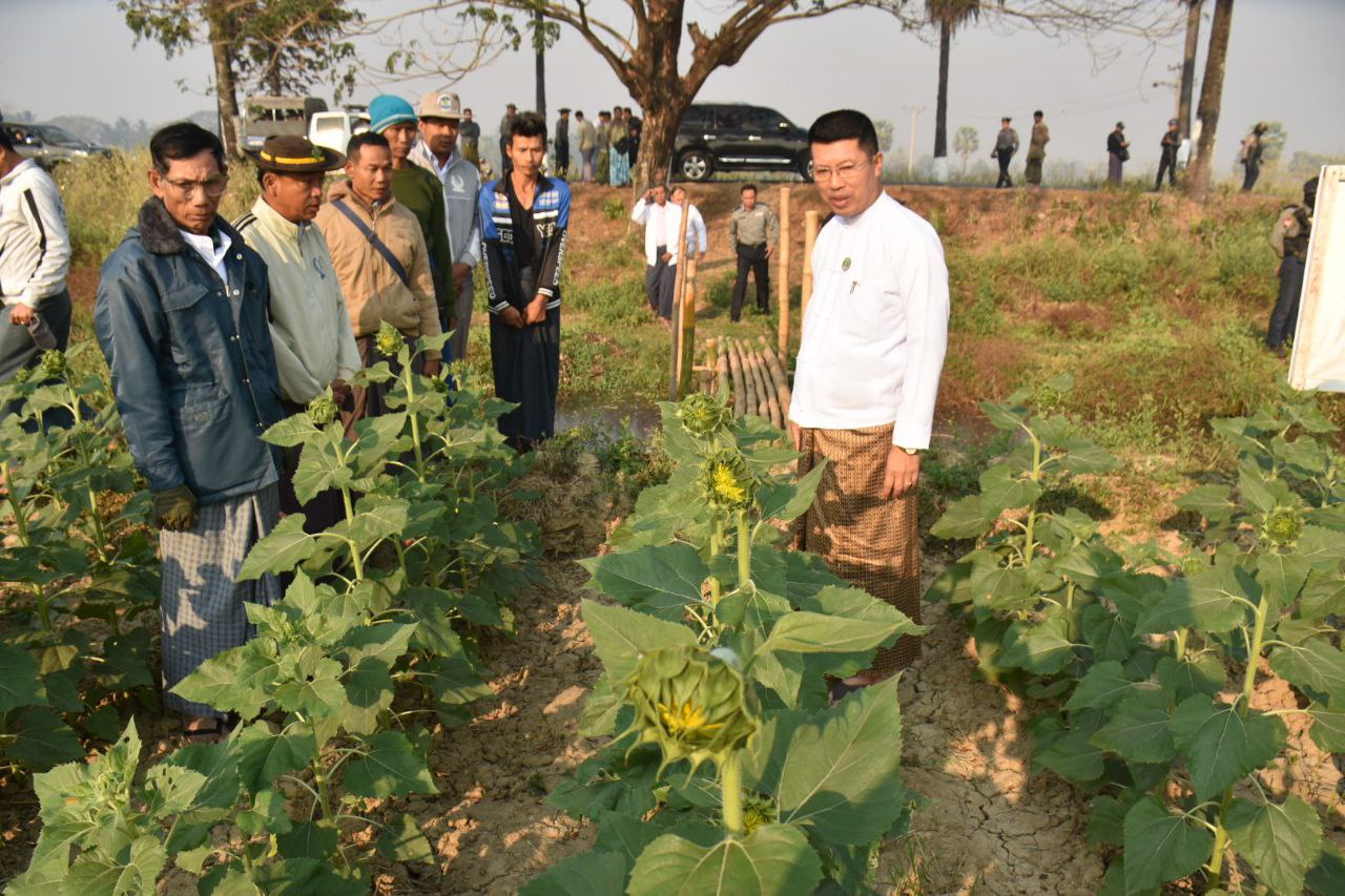 ထို့အတူ မြန်အောင်မြို့နယ်၊ ဆင်သေကျေးရွာ၊ တောင်သူဦးအောင်ဋ္ဌေး၏ စိုက်ဧက(၃)ဧကတို့တွင် စိုက်ပျိုးထားသည့် Super Sun-41 ဆောင်းနေကြာစိုက်ခင်းတို့အား ကြည့်ရှုအားပေးပြီး စိုက်ခင်းများသို့ ပိုးမွှားများမကျရောက်စေရေး ကြိုတင်ကာကွယ်ဆောင်ရွက်ကြရန်နှင့် ရေပေးခြင်း၊ မြေသြဇာကျွေးခြင်းလုပ်ငန်းများအပြင် အောင်မြင်ဖြစ်ထွန်းအောင် စိုက်ပျိုးဆောင်ရွက်စေရေးတို့အား မှာကြားခဲ့ကြောင်းသိရသည်။