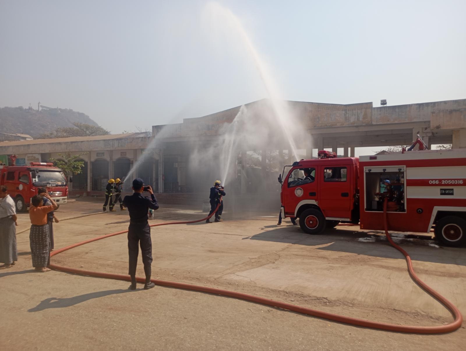 မန္တလေးတိုင်းဒေသကြီး ကျောက်ဆည်ခရိုင်၊ ကျောက်ဆည်မြို့ အေးမြကြည်လင်ဈေး၌ ယနေ့နံနက် ၁၀ နာရီက မီးဘေးကြိုတင်ကာကွယ်ရေး အသိပညာပေးဟောပြောခြင်းနှင့် လက်တွေ့မီးငြိမ်းသတ် ဇာတ်တိုက်လေ့ကျင်းမှုများကို မြို့နယ်မီးသတ်ဦးစီးဌာနနှင့် စည်ပင်သာယာရေးအဖွဲ့တို့ ပူးပေါင်း၍ ပြုလုပ်ခဲ့ကြောင်း သိရသည်။