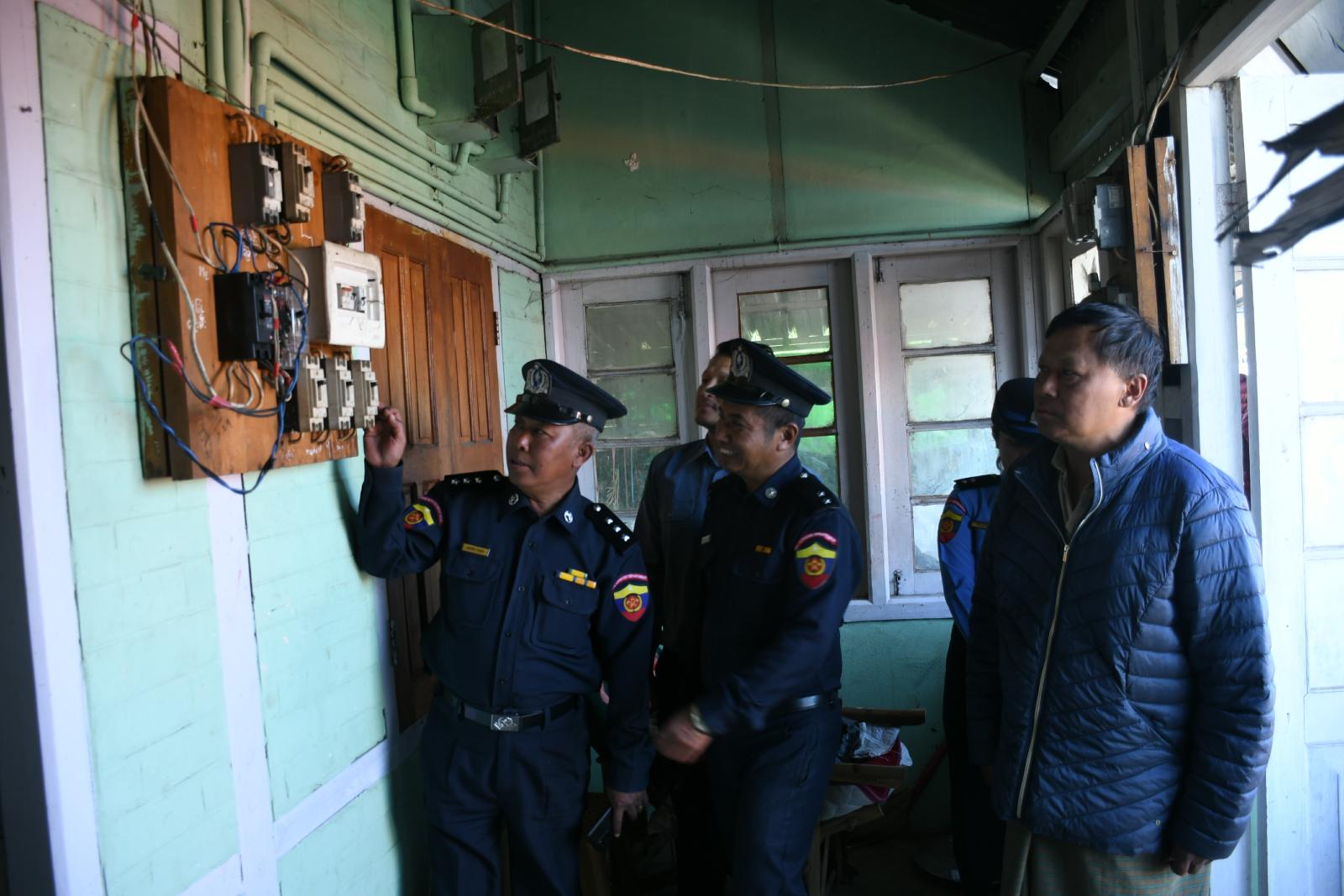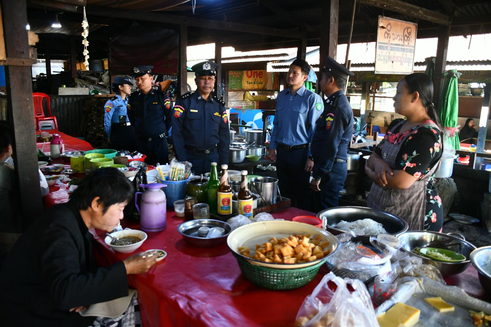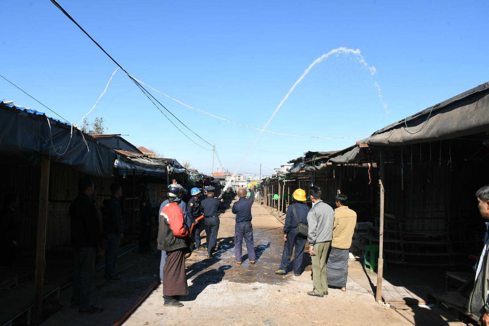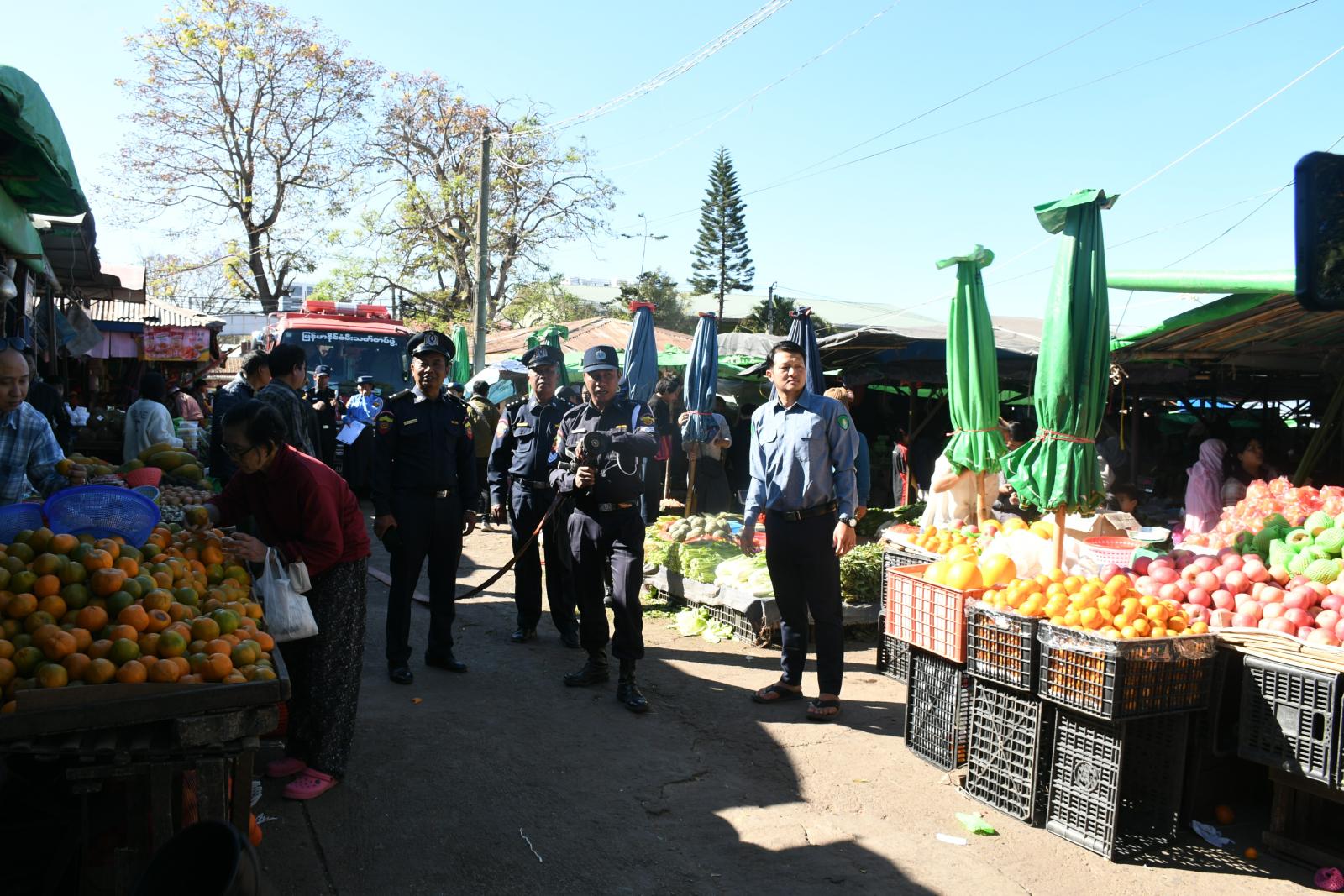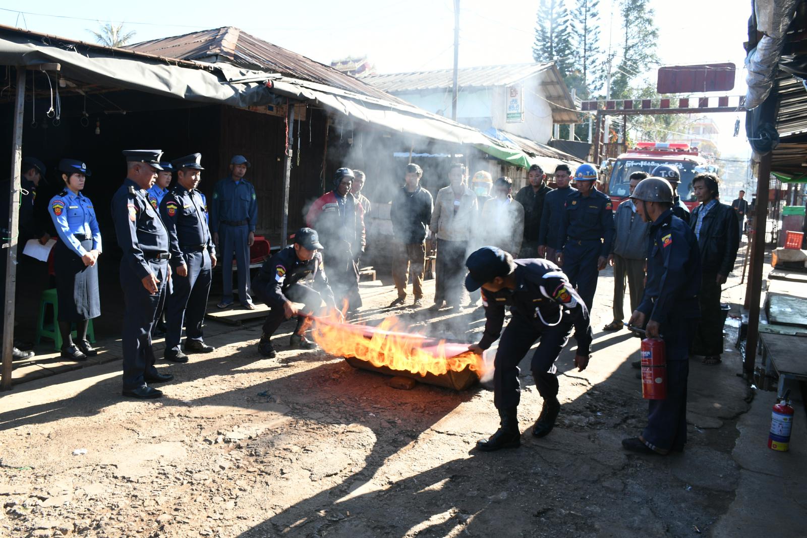 ထို့နောက် မြို့နယ်မီးသတ်ဦးစီးမှူးဦးမြင့်သန်းနှင့် မီးသတ်တပ်ဖွဲ့ဝင်များ၊ ဈေးတာဝန်ခံ ဦးကျော်မိုး၊ ဈေးအကျိုးတော်ဆောင်အဖွဲ့ဝင်များနှင့် ဝန်ထမ်းများ၊ ဈေးသူ၊ ဈေးသားများ ပူးပေါင်းမီးလောင်မှုဖြစ်ပွားခြင်း အမျိုးမျိုးတို့ကိုမီးသတ်ဆေးဘူးများ၊ မီးငြိမ်းသတ်အကူပစ္စည်းများဖြင့် ငြိမ်းသတ်ခြင်းများကို လက်တွေ့သရုပ်ပြပြီး၊ မီးဘေးအန္တရာယ်ကြိုတင်ကာကွယ်ရေးအတွက် ဈေးအတွင်းနှင့် အပြင်ရှိလုံခြုံရေးမီးတပ်ဆင်ဆောင်ရွက်ထားရှိမှုအခြေအနေများ၊ ဈေးဆိုင်ခန်းများကို သွယ်တန်းတပ်ဆင်ထားသောလျှပ်စစ်မီးကြိုးများနှင့် မီးခလုတ်များကောင်း/မကောင်း၊ လျှပ်စစ်မီးသုံးစွဲရာတွင် မီးဘေးလုံခြုံမှု ရှိ/မရှိ၊ ဈေးအတွင်းရှိစားသောက်ဆိုင်နှင့် လက်ဖက်ရည်ဆိုင်များ၏ မီးသုံးစွဲမှုအခြေအနေများကို ကြည့်ရှုစစ်ဆေးသည်။ ဆက်လက်၍ဈေးများ မီးလောင်မှုဖြစ်ပွားပါက အလျင်အမြန် မီးငြိမ်းသတ်နိုင်ရေးအတွက်နေရာယူခြင်း၊ ရှာဖွေကယ်ဆယ်ခြင်း၊ မီးသတ်ဆေးဘူး အသုံးပြုခြင်း၊ ရေဖျန်းခြင်းများကို လက်တွေ့သရုပ်ပြဆောင်ရွက်သည်။