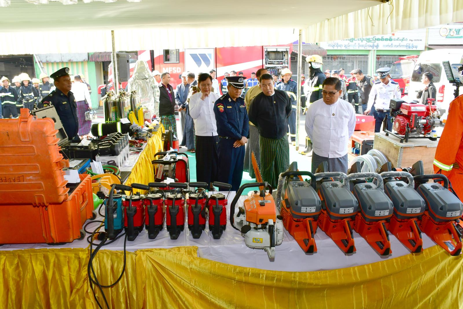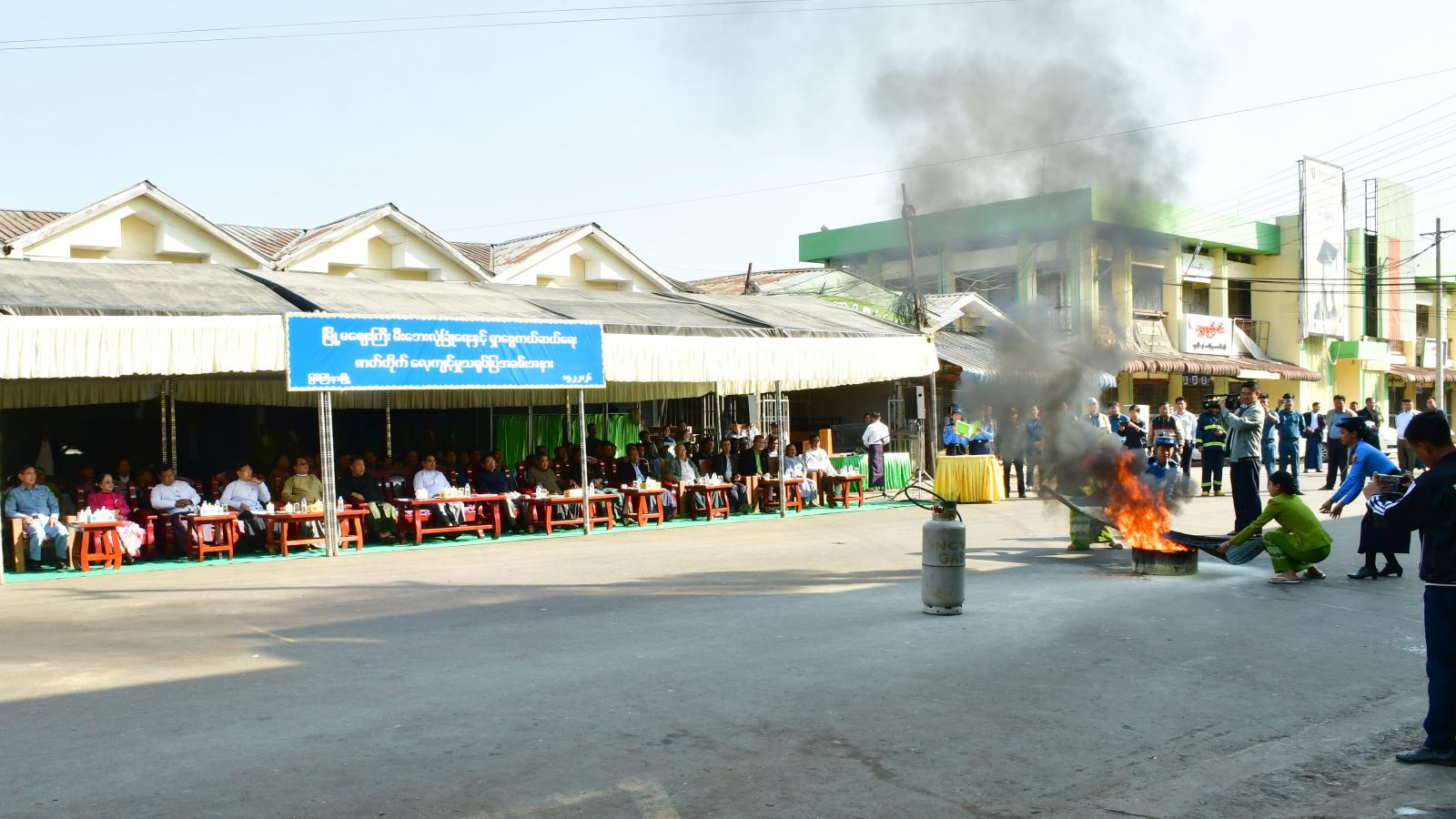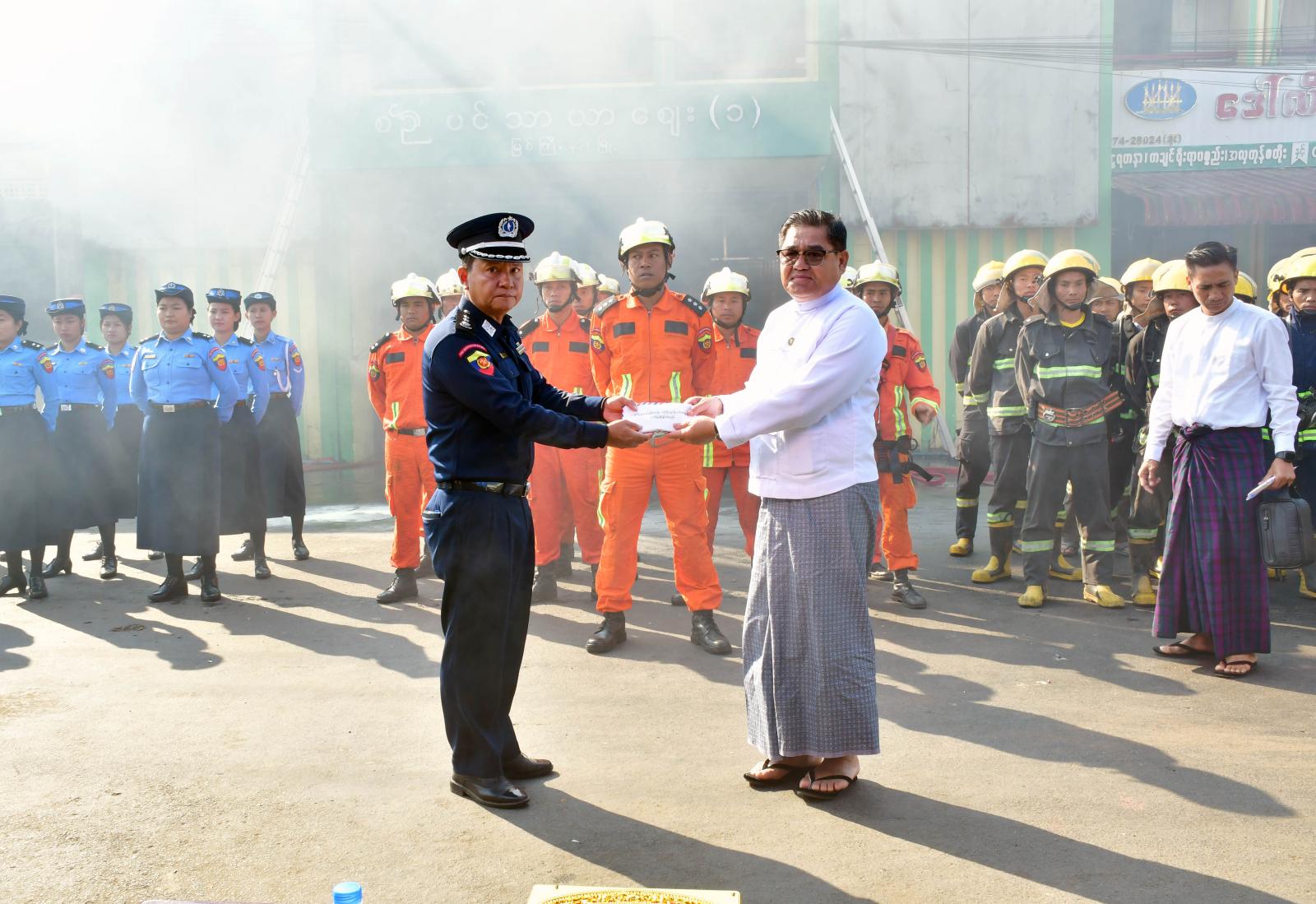ထို့နောက် မီးသတ်ဦးစီးဌာန တပ်ဖွဲ့ဝင်များက စည်ပင်သာယာရေးအဖွဲ့ဝန်ထမ်းများအား မီးသတ်ဆေးဘူးဖြင့် လက်တွေ့မီးငြှိမ်းသတ်ခြင်း၊ ဆီမီးလောင်မှုအားဖုံးအုပ်ငြှိမ်းသတ်ခြင်းနှင့် ဂက်(စ်) မီးလောင်မှုအား မီးငြှိမ်းသတ်ခြင်းတို့ကို သရုပ်ပြခြင်းနှင့် လက်တွေ့မီးငြှိမ်းသတ်ခြင်းလုပ်ငန်းများ ပူးပေါင်းဆောင်ရွက်ခဲ့ကြပြီး အမှတ် (၁) မီးလောင်မှုအား ခေတ်မီရှာဖွေကယ်ဆယ်ရေး ပစ္စည်းများ အသုံးပြု၍ မီးငြှိမ်းသတ်ကားများဖြင့် မီးငြှိမ်းသတ်ခြင်း၊ ရှာဖွေကယ်ဆယ်ရေးလုပ်ငန်းများ ဆောင်ရွက်ခြင်းတို့ကို လက်တွေ့ဇာတ်တိုက် သရုပ်ပြသမှုကို ကြည့်ရှုအားပေးခဲ့ကြပြီး ပြည်နယ်ဝန်ကြီးချုပ် က မီးသတ်တပ်ဖွဲ့ဝင်များအား ကြိုတင်ကာကွယ်ခြင်း၊ ဖြစ်စဉ်ကို ကြိုတင်ဇာတ်တိုက်လေ့ကျင့်ထား ခြင်းသည် ထိရောက်သော လုပ်ငန်းစဉ်ဖြစ်ပြီး ဝန်ထမ်းများနှင့် ဈေးသူ/ ဈေးသားများ ပူးပေါင်းပါဝင် ရန် လိုအပ်ကြောင်း ဂုဏ်ပြုပြောကြားပြီး မီးသတ်တပ်ဖွဲ့ဝင်များအတွက် ငွေကျပ် ၁၅ သိန်းနှင့် စည်ပင်သာယာရေးအဖွဲ့ဝန်ထမ်းများအတွက် ငွေကျပ် ၁၀ သိန်းကို ထောက်ပံ့ပေးအပ်ခဲ့သည်။