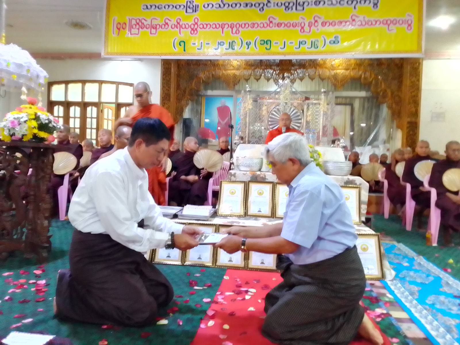 ဆက်လက်၍ စာအောင်သံဃာဆုပေးအပ်ပွဲကျင်းပရာ ပထမကြီးတန်း သုံးပါး၊ ပထမလတ်တန်း ရှစ်ပါး၊ ပထမငယ်တန်း ငါးပါး၊ အခြေပြုမူလတန်း ၄၃ ပါး၊ မူကြိုတန်း ၂၂ ပါး၊ စုစုပေါင်းသံဃာတော် ၈၁ ပါးတို့အား ပရိယတ္တိသာသနာနုဂ္ဂဟအသင်းဥက္ကဋ္ဌ ဦးအောင်ထူး၊ အတွင်းရေးမှူး ဦးကြီးမြင့်နှင့် တာဝန်ရှိသူများကစာအောင်ဆုများကို အသီးသီးဆက်ကပ်ခဲ့ကြပြီး အလှူရှင်များက စာအောင်သံဃာတော်များကို နဝကမ္မဝတ္ထုငွေများ ကိုယ်တိုင်ဆက်ကပ်လှူဒါန်းခဲ့ကြသည်။