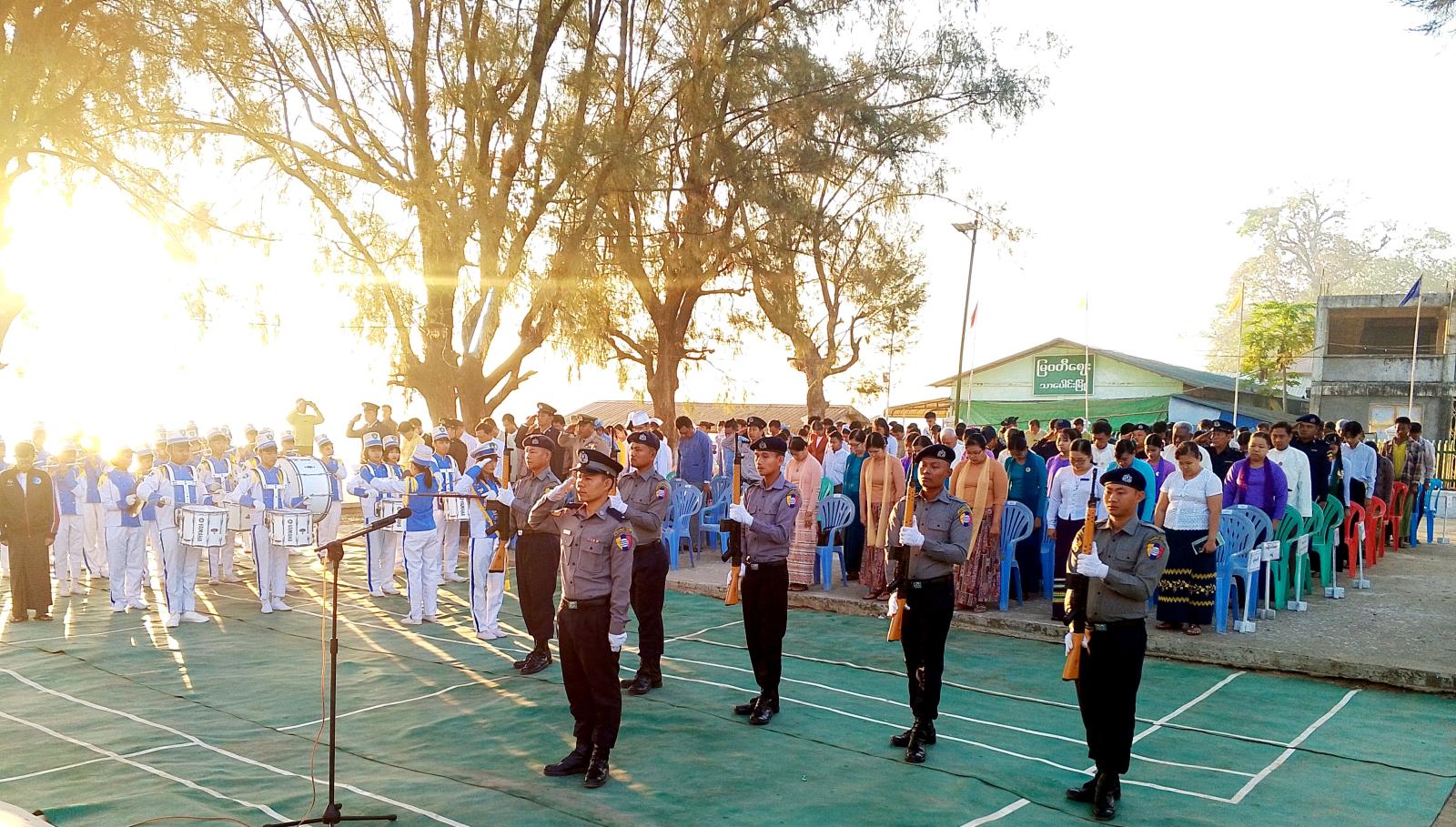 အခမ်းအနားတွင် မြန်မာနိုင်ငံရဲတပ်ဖွဲ့၏ ဂုဏ်ပြုတပ်ဖွဲ့မှဦးဆောင်၍ ပြည်ထောင်စုသမ္မတမြန်မာနိုင်ငံတော်အလံအား အလေးပြုခြင်းနှင့်ကျဆုံးလေပြီးသော ခေါင်းဆောင်ကြီးများနှင့်တပ်ဖွဲ့ဝင်အပေါင်းအား အလေးပြုကြပြီး