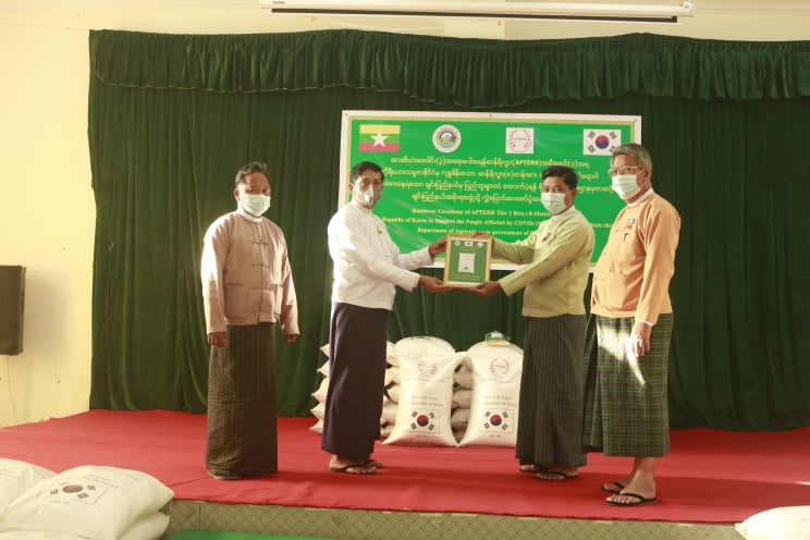 ထို့နောက် ချင်းပြည်နယ် စိုက်ပျိုးရေးဦးစီးဌာန ပြည်နယ်ဦးစီးမှူး ဦးအောင်မျိုးဦးက အာဆီယံအပေါင်း(၃) အရေးပေါ် အရန်ဆန်ရိက္ခာ(APTERR)အစီအစဉ်(၃)အရ ကိုရီးယားသမ္မတနိုင်ငံမှ လှူဒါန်းထားသည့် ဆန်ရိက္ခာ (၈)တန်ကို ချင်းပြည်နယ်ရှိ ကိုဗစ်-၁၉ ရောဂါ ခံစားရသည့် ပြည်သူများအတွက် ထောက်ပံ့နိုင်ခြင်းများနှင့် ပတ်သက်၍ ရှင်းလင်း ပြောကြားပြီးနောက် ဆန်ရိက္ခာ လွှဲပြောင်းပေးအပ်ခြင်း ဆက်လက်ကျင်းပရာ ချင်းပြည်နယ် စိုက်ပျိုးရေးဦးစီးဌာန ပြည်နယ်ဦးစီးမှူး ဦးအောင်မျိုးဦးနှင့် တာဝန်ရှိသူများက ဆန်ရိက္ခာများ လွှဲပြောင်းပေးအပ်ရာ ပြည်နယ်စိုက်ပျိုးရေး၊ မွေးမြူရေး၊ သစ်တောနှင့်သတ္တုဝန်ကြီး ဦးမန်ဟင်းဒါလ်နှင့် ပြည်နယ်အစိုးရအဖွဲ့ အတွင်းရေးမှူး ဦးတိုးဝင်းတို့က လက်ခံရယူပြီး ဂုဏ်ပြုမှတ်တမ်းလွှာ ပြန်လည်ပေးအပ် ခဲ့ကြသည်။