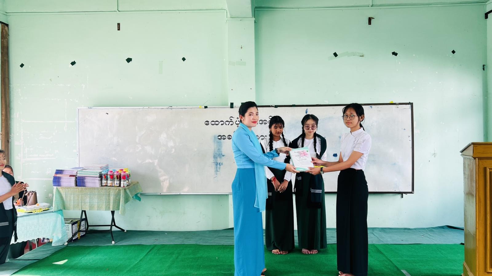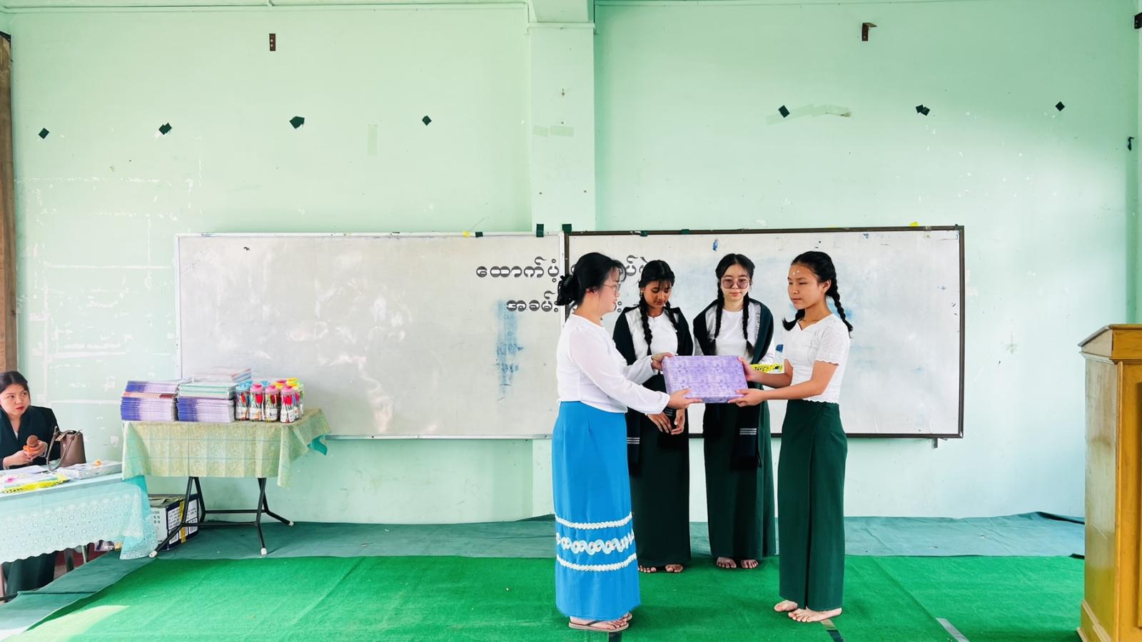ထို့နောက် မြို့နယ်စီမံခန့်ခွဲရေးနှင့်အုပ်ချုပ်ရေးကော်မတီဥက္ကဋ္ဌ မြို့နယ်အုပ်ချုပ်ရေးမှူးနှင့် မြို့နယ်အဆင့်ဌာနဆိုင်ရာမှတာဝန်ရှိသူများ၊ မြို့နယ်အမျိုးသမီးရေးရာအဖွဲ့ဥက္ကဋ္ဌ ဒေါ်မျိုးအေးချိုနှင့် မြို့နယ်မိခင်နှင့်ကလေးစောင့်ရှောက်ရေးအသင်းမှ တာဝန်ရှိသူများက တန်ဖိုး ၈၅၀၁၅၀၀ ကျပ်ရှိ သင်ထောက်ကူပြုပစ္စည်းများ၊ ဆက်သွယ်ရေးခက်ခဲသော အ.မ.က(မိုင်းဟစ်)၊ အ.မ.က-နမ့်နော်(အပေါ်)ကျောင်းတို့အတွက် တန်ဖိုး ၁၁ သိန်းရှိ ဆက်သွယ်ရေးပစ္စည်းများကိုပေးအပ်ပြီး ကျောင်းသားတစ်ဦးမှ ပေးအပ်ခြင်းအတွက် ကျေးဇူးတင်စကား ပြန်လည်ပြောကြားခဲ့သည်။