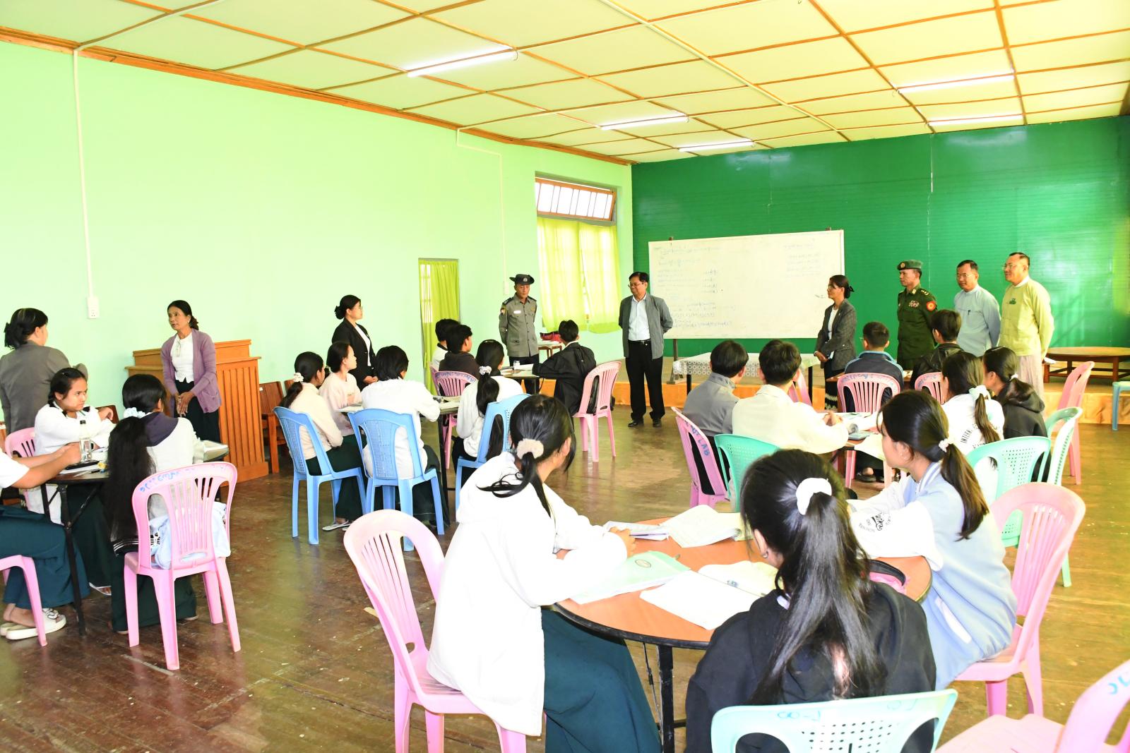 ဆက်လက်၍ ပြည်နယ်ဝန်ကြီးချုပ်နှင့် တာဝန်ရှိသူများသည် အမှတ်(၂) အခြေခံပညာအထက်တန်းကျောင်းမှ Grade 12 ကျောင်းသားကျောင်းသူများ တက္ကသိုလ်ဝင်စာမေးပွဲ အောင်ချက်မြင့်မားရေးစာကျက်ဝိုင်း၌ သင်ကြားလေ့လာကျက်မှတ်နေမှုများကို ကြည့်ရှုူအားပေးပြီး ဆရာ၊ ဆရာမများ ကျောင်းသားကျောင်းသူများအား ရင်းနှီးနွေးထွေးစွာ အားပေးစကားပြောကြားသည်။