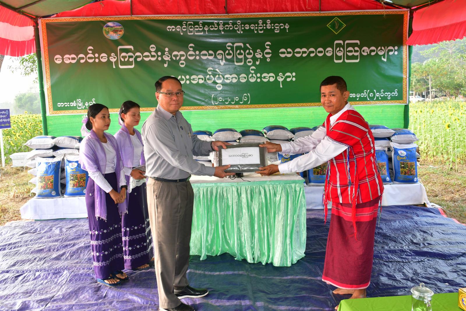 ထို့နောက် ပြည်နယ်စိုက်ပျိုးရေးဦးစီးဌာနမှူးဦးထွန်းမြင့်က နေကြာသီးနှံစိုက်ပျိုးနည်းစနစ်များကို ရှင်းလင်းပြောကြားပြီး ပြည်နယ်ဝန်ကြီးချုပ်၊ ပြည်နယ်တရားလွှတ်တော်တရားသူကြီးချုပ် ဦးညွန့်လင်း၊ ပြည်နယ်ဝန်ကြီးများက ဘားအံမြို့နယ်အတွင်းရှိ ထောင်ဝိ၊ ရဲသာ၊ တရုတ်လှ၊ ကော့ကျိုက် အစရှိသောကျေးရွာ ၁၀ ရွာမှ နေကြာစိုက် တောင်သူ ၁၀၀ အား ဩဇာမင်းသဘာဝမြေဩဇာ အိတ်(၁၀၀)ကို အခမဲ့ချီးမြှင့်ပေးအပ်သည်။