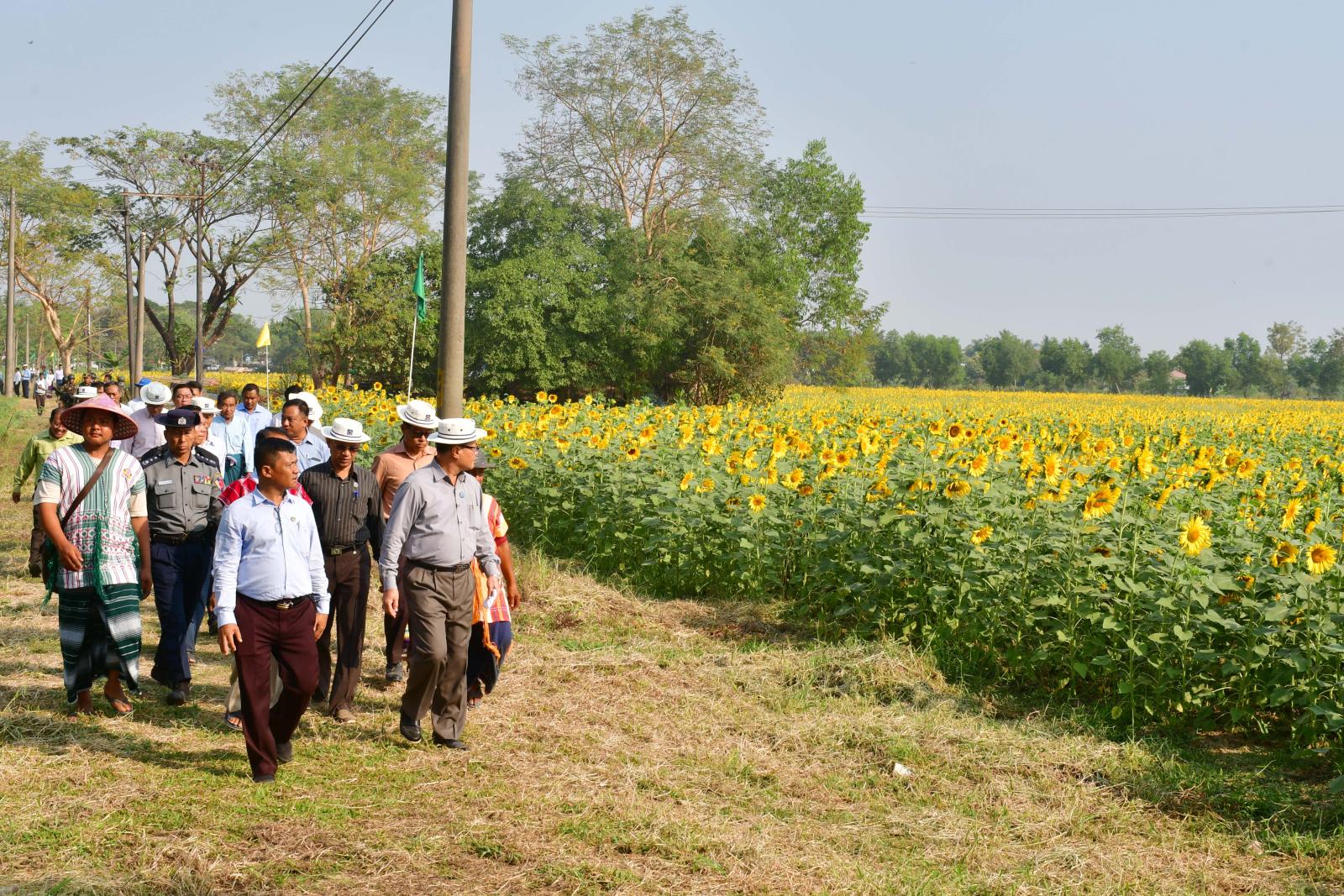 ယင်းနောက် ပြည်နယ်ဝန်ကြီးချုပ်နှင့်တာဝန်ရှိသူများ၊ ကျေးရွာ(၁၀)ရွာမှ တက်ရောက်လာသော နေကြာစိုက်တောင်သူများက ဘားအံမြို့ အမှတ်(၈)ရပ်ကွက်၊ ထောင်ဝိကွင်းရှိ အောင်မြင်ဖြစ်ထွန်းနေသော ဆောင်းနေကြာ အထွက်နှုန်းတိုးတက်ရေး စံပြကွက်(၆၈)ဧကအား ကြည့်ရှုအားပေးသည်။ စိုက်ပျိုးရေးဦးစီးဌာန ပြည်နယ်ဦးစီးမှူးက နေကြာ သီးနှံ (၁၅)ရက်သားတွင် အပင်သားခွဲခြင်းလုပ်ငန်းဆောင်ရွက်မှု၊ (၄၀)ရက်သားတွင် မြေဩဇာကျွေးဘောင်တင်ခြင်း လုပ်ငန်းဆောင်ရွက်မှုအခြေအနေများကို ရှင်းလင်းတင်ပြရာ ပြည်နယ်ဝန်ကြီးချုပ်က လိုအပ်သည်များပေါင်းစပ်ညှိနှိုင်း ဖြည့်ဆည်းဆောင်ရွက်ပေးသည်။