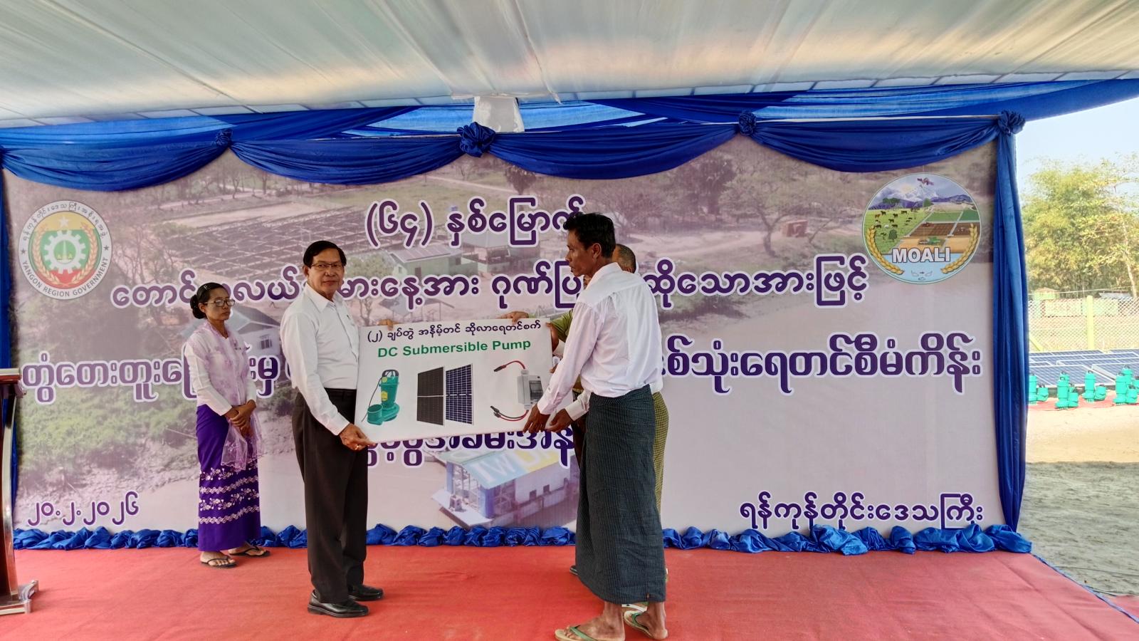 ဦးစွာ ရန်ကုန်တိုင်းဒေသကြီးဝန်ကြီးချုပ် ဦးစိုးသိန်းက အဖွင့်အမှာစကား ပြောကြားခဲ့သည်။ ထို့နောက် ရန်ကုန်တိုင်းဒေသကြီး ဆည်မြောင်းနှင့်ရေအသုံးချမှုစီမံခန့်ခွဲရေးဦးစီးဌာန၊ ညွှန်ကြားရေးမှူး ဦးကျော်နိုင်ဦးက လုပ်ငန်းဆိုင်ရာများကို ရှင်းလင်းတင်ပြသည်။ ဆက်လက်၍ ရန်ကုန်တိုင်းဒေသကြီးဝန်ကြီးချုပ် ဦးစိုးသိန်းနှင့်အဖွဲ့ဝင်များက (၂) ချပ်တွဲအနိမ့်တင် ဆိုလာပန့် အစုံ (၁၈) ကို တွံတေးမြို့နယ်မှ တောင်သူများနှင့် တာဝန်ရှိသူများအားလည်းကောင်း၊ (၂)ချပ်တွဲ အနိမ့်တင်ဆိုလာပန့်အစုံ (၁၆) ကို ကော့မှူးမြိုနယ်မှ တောင်သူများနှင့် တာဝန်ရှိသူများအား လည်းကောင်း၊ (၂) ချပ်တွဲ အနိမ့်တင်ဆိုလာပန့်အစုံ (၃၅) ကို ကွမ်းခြံကုန်းမြိုနယ်မှ တောင်သူများနှင့် တာဝန်ရှိသူများအားလည်းကောင်း၊ (၂) ချပ်တွဲ အနိမ့်တင်ဆိုလာပန့်အစုံ (၁၀) ကို ဒလမြိုနယ်မှ တောင်သူများနှင့် တာဝန်ရှိသူများအားလည်းကောင်း အသီးသီးပေးအပ်ခဲ့ပြီး တောင်သူများကိုယ်စား တွံတေးမွေးမြူရေးဇုန်ဥက္ကဋ္ဌ ဦးတင်ရွှေက ကျေးဇူးတင်စကား ပြန်လည်ပြောကြားခဲ့သည်။