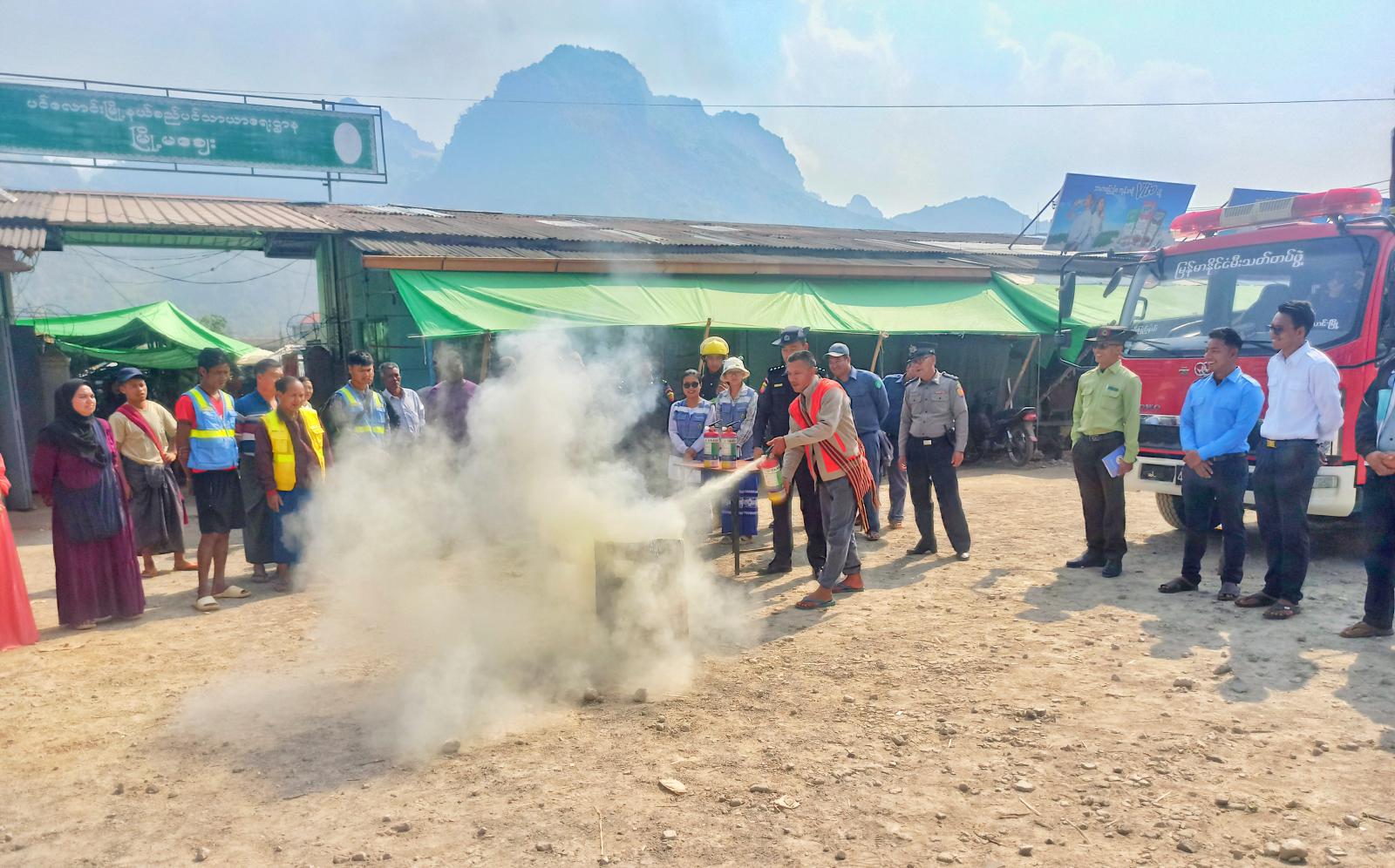 ထို့နောက် မြို့နယ်မီးသတ်ဦးစီးဌာန မြို့နယ်ဦးစီးမှူးက ဈေးရောင်းဈေးဝယ်သူများအား မီးဘေးအန္တရာယ်ကြိုတင်ကာကွယ်ရမည့် ပစ္စည်းများထားရှိရေး၊ မီးသတ်ဆေးဘူး အသုံးပြုပုံအဆင့်ဆင့်နှင့် မီးသတ်ဆေးဘူးဖြင့် စနစ်တကျ မီးငြှိမ်းသတ်ပုံများကို ရှင်းလင်းပြောကြားပြီး ဈေးရောင်းဈေးဝယ်သူများက မီးသတ်ဆေးဘူးဖြင့် မီးငြှိမ်းသတ်မှုကို လက်တွေ့သရုပ်ပြဆောင်ရွက်ခြင်းနှင့် မီးသတ်ဦးစီးဌာနမှ မီးသတ်ကားဖြင့် မီးငြှိမ်းသတ်မှု လက်တွေ့သရုပ်ပြခြင်း ဆောင်ရွက်ခဲ့ကြကြောင်း သိရသည်။