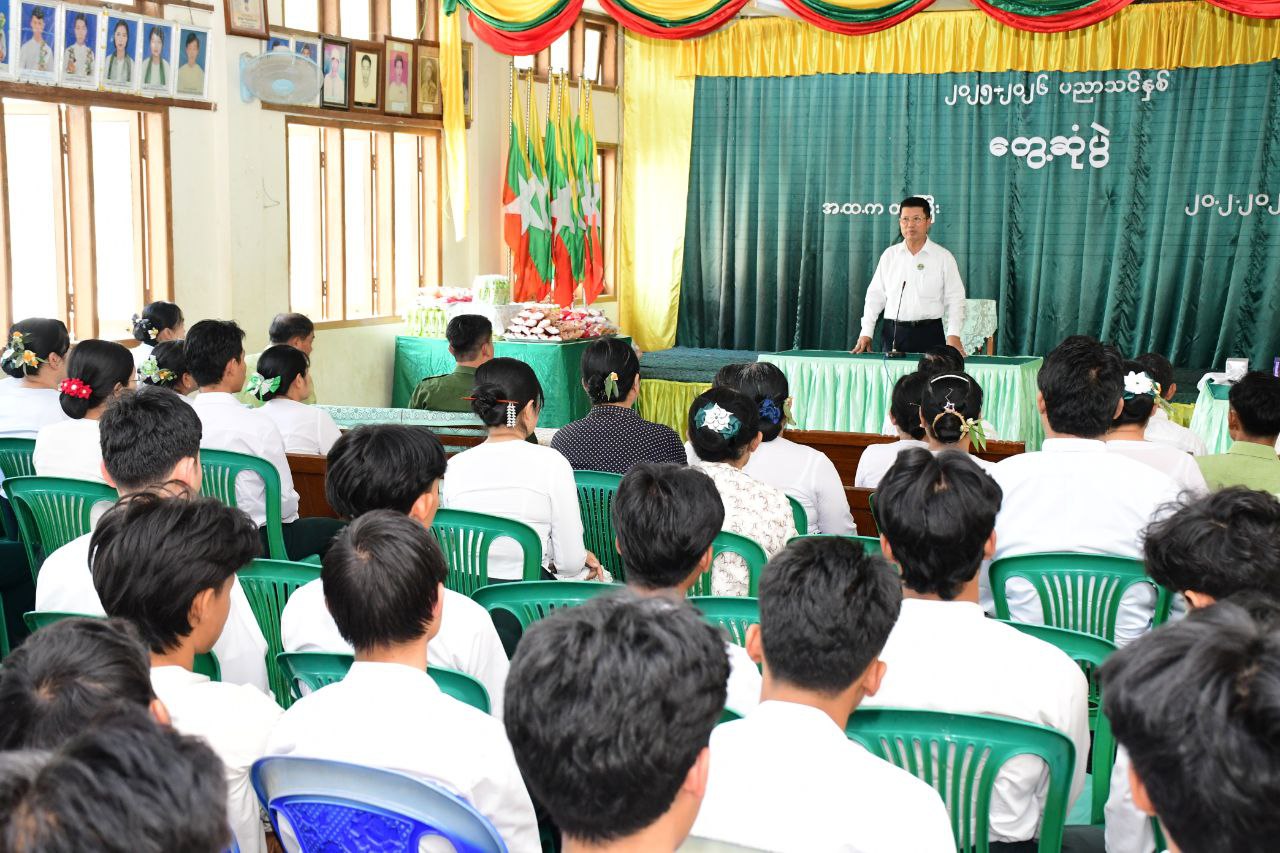 ဆက်လက်၍ တိုင်းဒေသကြီးဝန်ကြီးချုပ်သည် အင်္ဂပူမြို့နယ်၊ ထူးကြီးမြို့အခြေခံပညာအထက်တန်းကျောင်းတွင် ပြုလုပ်သည့် Grade-12 သင်ဆရာ၊ ဆရာမများ၊ Grade-12 ကျောင်းသား၊ ကျောင်းသူများနှင့် တွေ့ဆုံပွဲသို့ တက်ရောက်ခဲ့ပြီး “တက္ကသိုလ်ဝင်စာမေးပွဲ အောင်ချက်မြင့်မားရေးအတွက် နှစ်စဉ်ကြိုးပမ်းဆောင်ရွက်လျက်ရှိပါကြောင်းနှင့် ဘာသာရပ်ဆိုင်ရာသိကောင်းစရာ ဆွေးနွေးဟောပြောပွဲများကိုလည်း တက္ကသိုလ်မှ ဆရာကြီး၊ ဆရာမကြီးများဖြင့် ပြုလုပ်လျက်ရှိပါကြောင်း၊ ကျောင်းသား၊ ကျောင်းသူများ အားနည်းသည့် ဘာသာရပ်များအလိုက် ထိရောက်စွာ အချိန်ပိုသင်ကြားခြင်းများကိုလည်း ဆောင်ရွက်လျက်ရှိပါကြောင်း၊ တက္ကသိုလ်ဝင်တန်းအကြိုစာမေးပွဲများကိုလည်း ဖြေဆိုပြီးဖြစ်၍ ကျောင်းသားကျောင်းသူများ၏ အားနည်းချက်အားသာချက်များအလိုက် ပိုမိုဖြည့်ဆည်း သင်ကြားပေးရန်လိုပါကြောင်းနှင့် တစ်ကြိမ်ထက်တစ်ကြိမ် တိုးတက်မှုရှိရန် လိုအပ်မည်ဖြစ်ပါကြောင်း၊ တက္ကသိုလ်ဝင်စာမေးပွဲအောင်ချက်မြင့်မားရေးအတွက်လည်း တာဝန်ရှိသူအားလုံးက ပူးပေါင်းဆောင်ရွက်ရန် လိုအပ်မည်ဖြစ်ပါကြောင်း” ပြောကြားခဲ့ပြီး ဆရာ၊ ဆရာများနှင့် ကျောင်းသား၊ ကျောင်းသူများအတွက် ချီးမြှင့်ငွေများနှင့် စားသောက်ဖွယ်ရာများ ပေးအပ်ခဲ့သည်။ ယင်းနောက် တိုင်းဒေသကြီးဝန်ကြီးချုပ်နှင့် ဇနီးသည် အင်္ဂပူမြို့နယ်၊ ထူးကြီးမြို့ ဝါဆိုမဟာစည်သာသနာ့ရိပ်သာကျောင်းတိုက်ဆရာတော် ဦးသုဇာတအား ဖူးမြော်ကြည်ညို၍ သာသနာရေးဆိုင်ရာကိစ္စရပ်များနှင့် ဒေသဖွံ့ဖြိုးရေးကိစ္စရပ်များအား တင်ပြလျှောက်ထားကာ လှူဖွယ်ပစ္စည်းများ ဆက်ကပ်လှူဒါန်းခဲ့ကြောင်း သိရသည်။