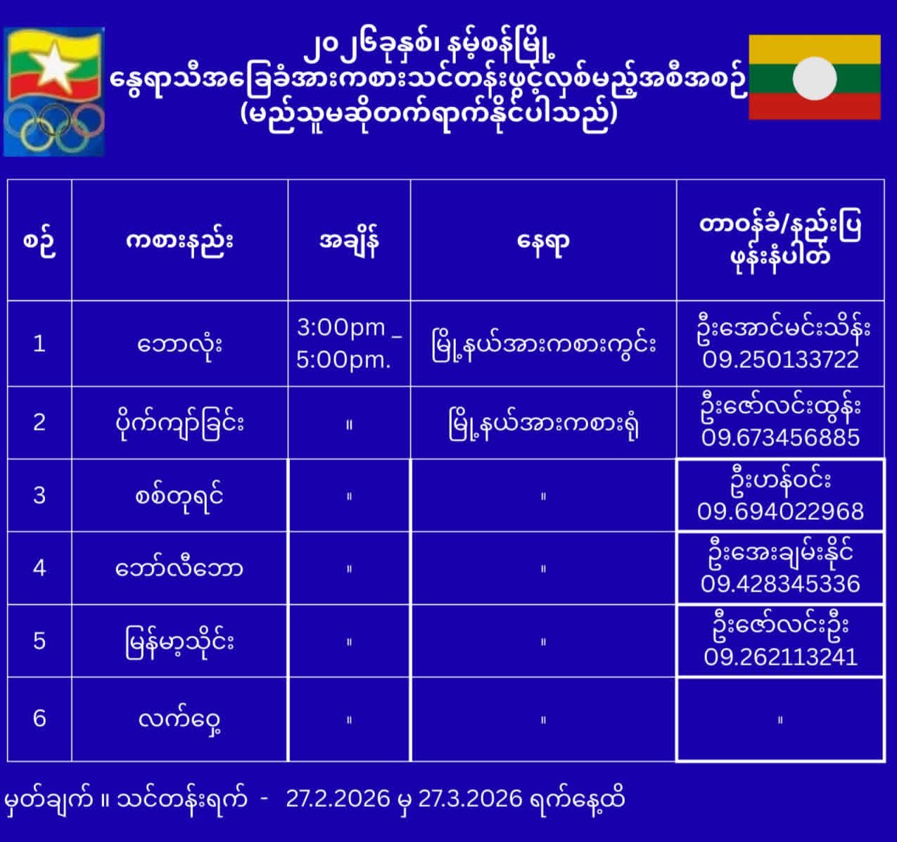 အဆိုပါသင်တန်းတွင် ဘောလုံး၊ မြန်မာ့သိုင်း၊ လက်ဝှေ့၊ ပိုက်ကျော်ခြင်း၊ ဘော်လီဘောနှင့် စစ်တုရင် စသည့်အားကစားနည်း (၆) မျိုးကို တစ်လကြာ အခမဲ့ဖွင့်လှစ်သင်ကြားပို့ချ ပေးသွားမည်ဖြစ်ကြောင်း သိရသည်။