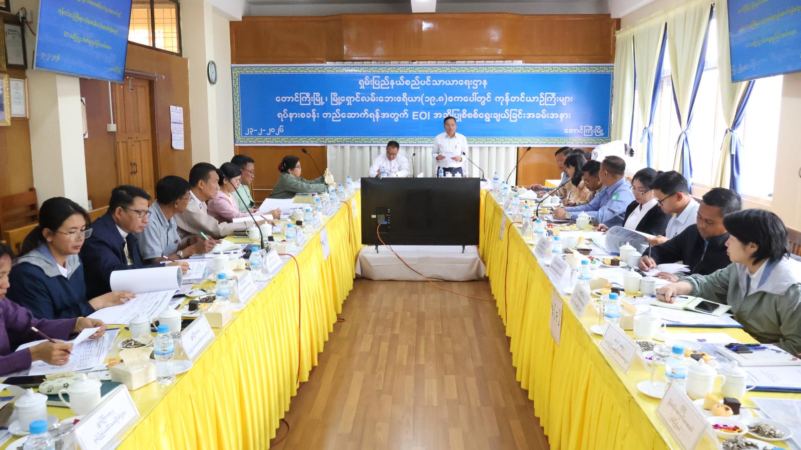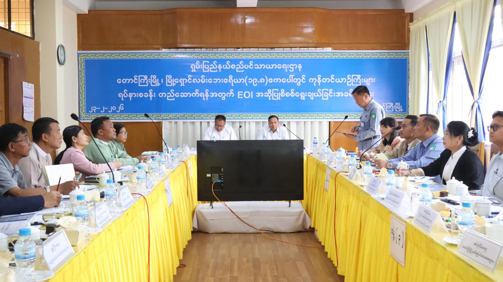ဦးစွာ ပြည်နယ်လမ်းပန်းဆက်သွယ်ရေးဝန်ကြီး ဦးနေဝင်းအောင်က အဖွင့်အမှာစကားပြောကြားပြီး ရှမ်းပြည်နယ်စည်ပင်သာယာရေးဌာန ညွှန်ကြားရေးမှူး ဦးစိုင်းထွန်းထွန်းက EOI ခေါ်ယူခဲ့မှု အခြေအနေများအားရှင်းလင်းတင်ပြသည်။ ထို့နောက် ကုမ္ပဏီမှတာဝန်ရှိသူများက လုပ်ငန်းဆောင်ရွက်မည့်အစီအစဉ်များအား ရှင်းလင်းတင်ပြရာတင်ပြမှုများအပေါ် EOI ကော်မတီဝင်များက အထွေထွေဆွေးနွေးကြပြီး ပြည်နယ်ဝန်ကြီးများက လိုအပ်သည်များ ပေါင်းစပ်ညှိနှိုင်းဆောင်ရွက်ပေးသည်။ ဆက်လက်၍ အဆိုပြုလွှာကို ဖွင့်ဖောက်စစ်ဆေးပြီး ပြည်နယ်လမ်းပန်းဆက်သွယ်ရေးဝန်ကြီးက နိဂုံးချုပ်အမှာစကား ပြောကြားခဲ့ကြောင်း သိရသည်။