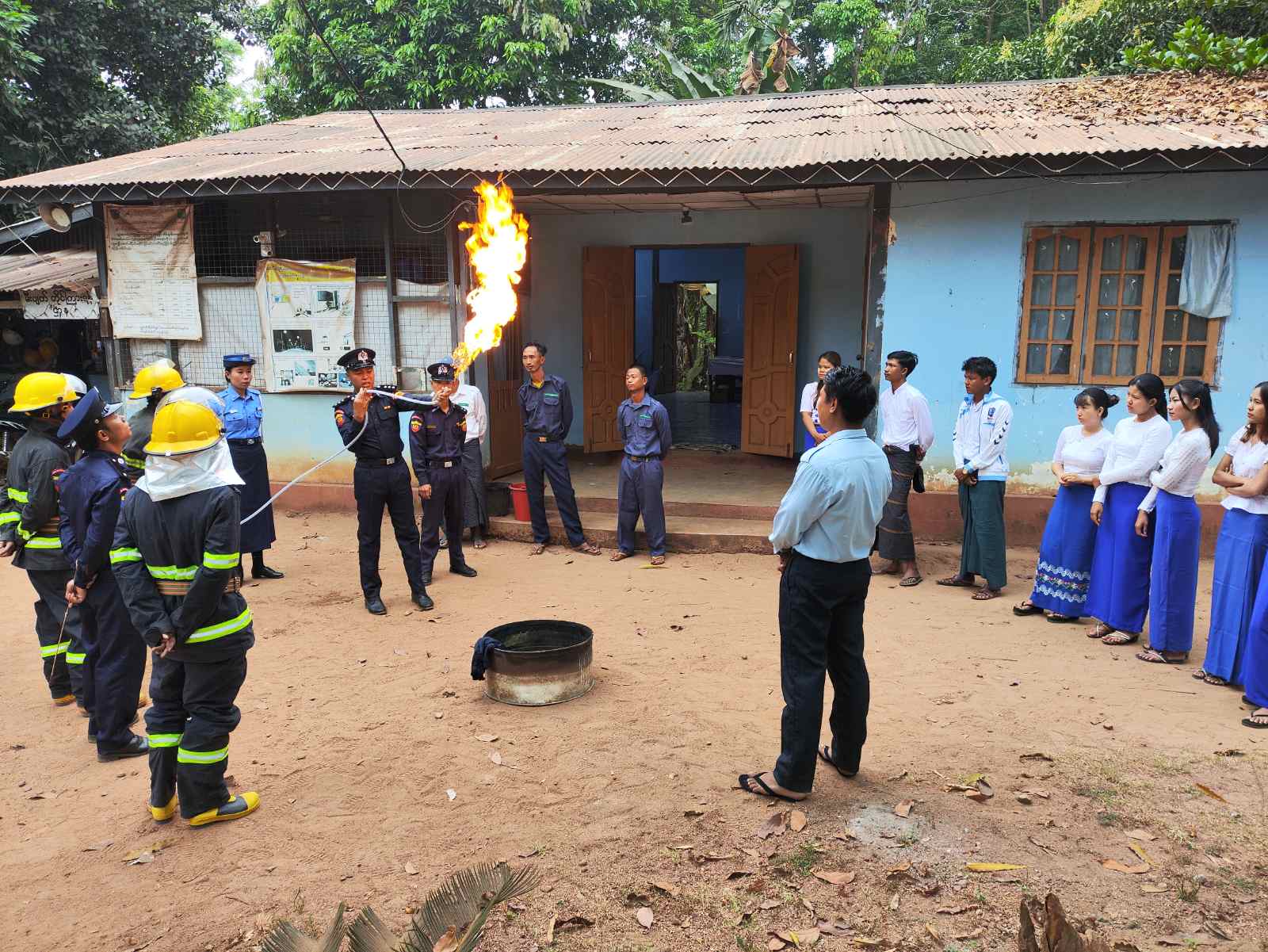 မီးဘေးလုံခြုံရေး၊ ကြိုတင်ကာကွယ်ရေးနှင့်လက်တွေ့သရုပ်ပြသခြင်းကို မြို့နယ်မီးသတ်ဦးစီးဌာနမှ ဦးစီးအရာရှိ ဦးမျိုးကျော်အောင်နှင့်ဝန်ထမ်းများက မီးဘေးအန္တရာယ်ဖြစ်ပေါ်လာပါက ဆောင်ရွက်ရမည့်နည်းလမ်းများ၊ မီးဘေးအန္တရာယ်ကြုံတွေ့ရပါက မီးငြိမ်းသတ်နည်းများကို လက်တွေ့သရုပ်ပြသပေးခဲ့သည်။