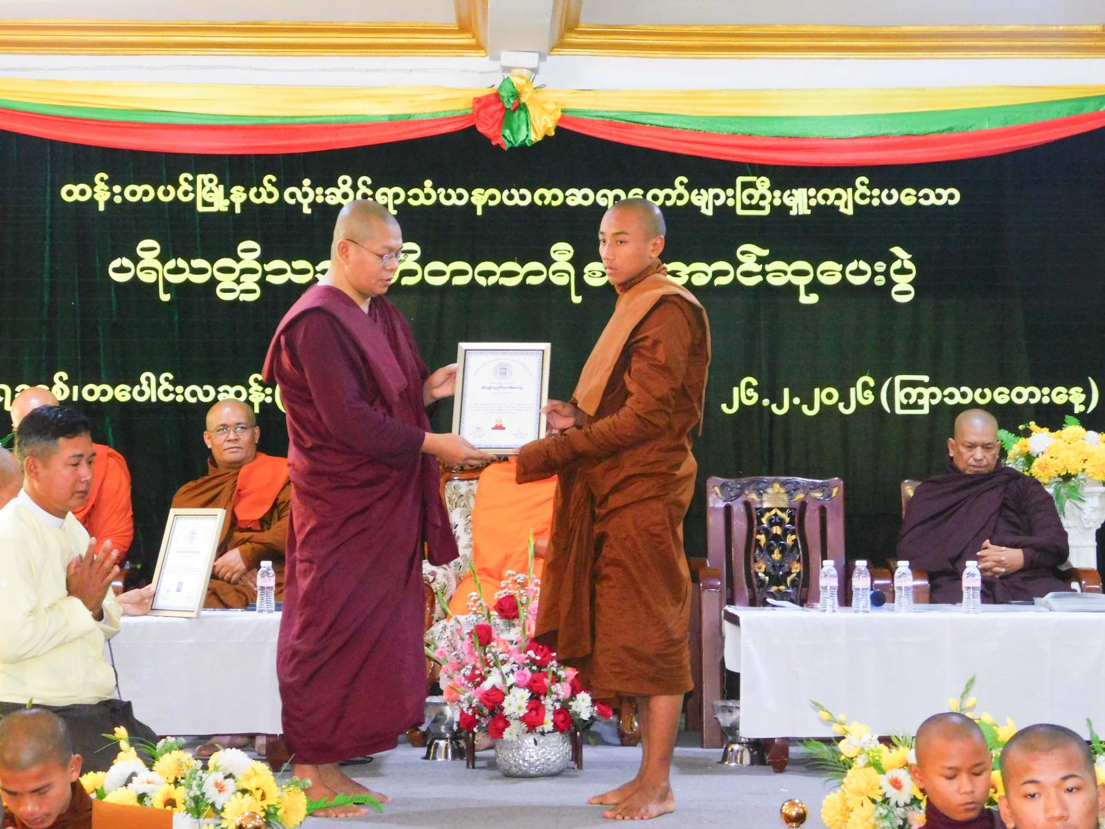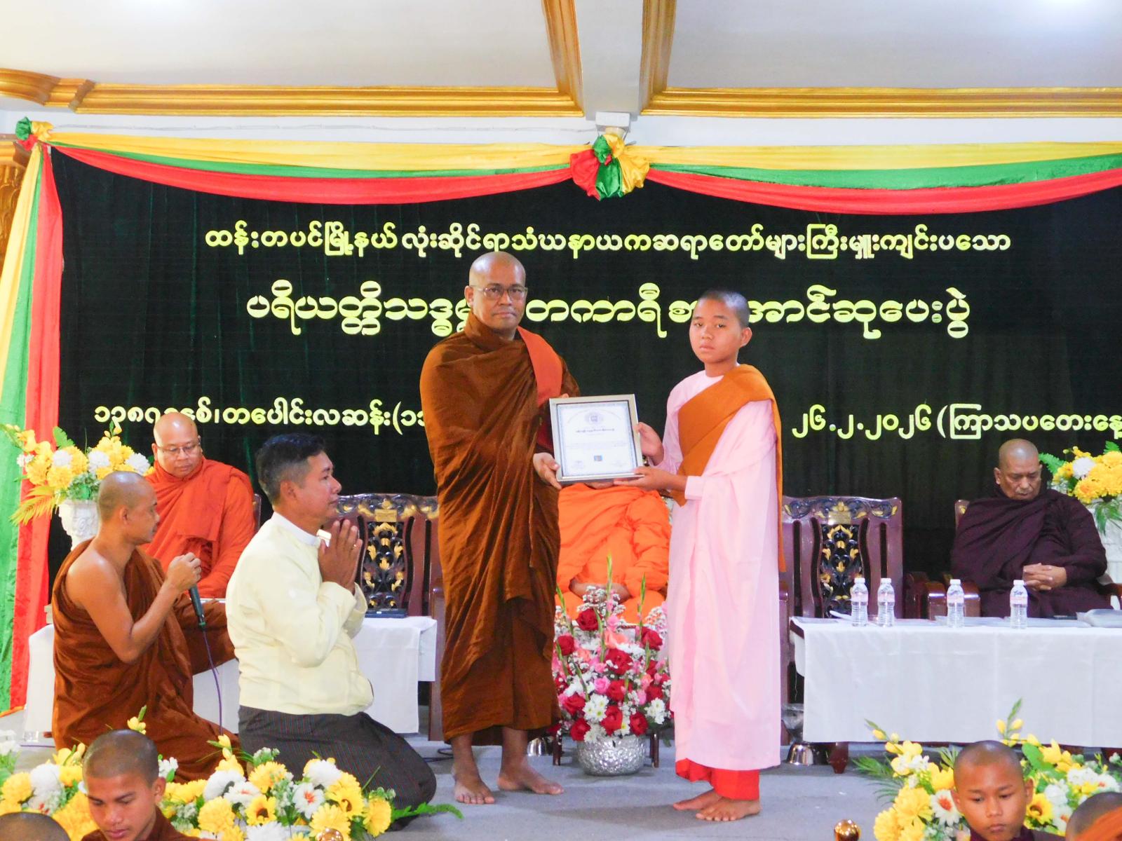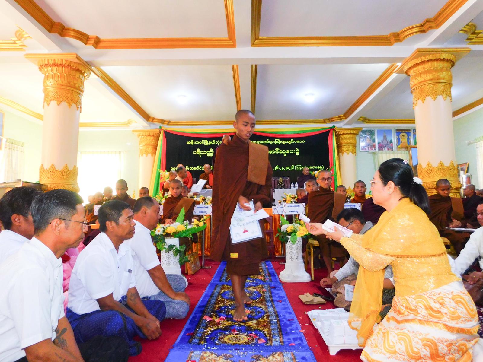 ထို့နောက် မြို့နယ်သံဃနာယကဆရာတော်ကြီးများမှ ကြီးမှူးကျင်းပသော ပရိယတ္တိသဒ္ဓမ္မဟိတကာရီ စာမေးပွဲပထမလတ်တန်းတွင် အောင်မြင်တော်မူသည့် စာအောင်သံဃာ (၄) ပါးနှင့် သီလရှင် (၁) ပါး၊ ပထမငယ်တန်းတွင် အောင်မြင်တော်မူသည့် စာအောင်သံဃာ (၁၅) ပါးနှင့် သီလရှင် (၁) ပါး၊ အခြေပြုမူလတန်းတွင် အောင်မြင်တော်မူသည့် စာအောင်သံဃာ (၃၆) ပါးနှင့် သီလရှင် (၂) ပါး၊ အခြေပြုတန်းတွင် အောင်မြင်တော်မူသည့် စာအောင်သံဃာ (၃၈) ပါးနှင့် ရှင်သာမဏေတန်းတွင် အောင်မြင်တော်မူ သည့် စာအောင်သံဃာ (၈၃) ပါးနှင့် သီလရှင် (၂) ပါးတို့အား မြို့နယ်သံဃနာယကအဖွဲ့ဥက္ကဋ္ဌ ကျောင်းကုန်းကျေးရွာ ရတနာသိင်္ဂီကျောင်း ဆရာတော်ဘဒ္ဒန္တ ဒေါက်တာရေဝတ၊ မြို့နယ်သံဃနာယကအဖွဲ့ ဒုတိယဥက္ကဋ္ဌ စိန္တိတာရာမနိမ္မိတာရုံကျောင်း ဆရာတော် ဘဒ္ဒန္တစိန္တိတ၊ မြို့နယ်သံဃနာယကအဖွဲ့အကျိုးတော်ဆောင် ပညာပါရမီဓမ္မာရိပ်သာ ကျောင်းတိုက်ဆရာတော် ဘဒ္ဒန္တအဂ္ဂါစာရနှင့် မြို့နယ်သံဃနာယက အဖွဲ့ဝင်ဆရာတော်များက အောင်လက်မှတ်များနှင့် ဆုများကို ပေးအပ်ခဲ့ကြပြီးဒါယကာ၊ ဒါယိကာမအပေါင်းတို့မှ လှူဘွယ်ဝတ္ထုများ ဆက်ကပ်လှူဒါန်းခဲ့ကြကြောင်း သိရသည်။