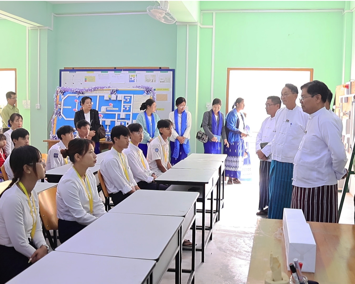 ဦးစွာ ပြည်နယ်ဝန်ကြီးချုပ်နှင့်တာဝန်ရှိသူများသည် အစိုးရစက်မှုလက်မှုသိပ္ပံနှင့် အစိုးရနည်းပညာအထက်တန်းကျောင်းသို့ရောက်ရှိပြီး ကျောင်းသား၊ ကျောင်းသူများနှင့်တွေ့ဆုံ၍ နှုတ်ဆက်စကားပြောကြားရာ စိုက်ပျိုးမွေးမြူရေးကိုအခြေခံသည့် စက်မှုကုန်ထုတ်လုပ်ငန်းများ ဖွံ့ဖြိုးတိုးတက်အောင်ဆောင်ရွက်ရမည်ဖြစ်ကြောင်း၊ စက်မှုလုပ်ငန်းများဖွံ့ဖြိုးတိုးတက်ရေးအတွက် တီထွင်ကြံဆမှုများနှင့်အတူ သုတေသနလုပ်ငန်းစဉ်များသည်လည်း အရေးကြီးပါကြောင်း၊ Grade-12 ဖြေဆိုမည့် ကျောင်းသား၊ ကျောင်းသူများအနေဖြင့် Grade-12 အောင်မြင်ပြီးပါက သက်ဆိုင်ရာတက္ကသိုလ်များသို့ ဆက်လက်တက်ရောက်သင်ယူနိုင်သည့် အခွင့်အလမ်းများရှိ၍ ကြိုးစားကြရန်အားပေးစကားပြောကြားပြီး တက္ကသိုလ်ဝင်စာမေးပွဲဖြေဆိုမည့် ကျောင်းသား၊ ကျောင်းသူများနှင့် နည်းပြဆရာများအား ချီးမြှင့်ငွေများပေးအပ်ခဲ့သည်။