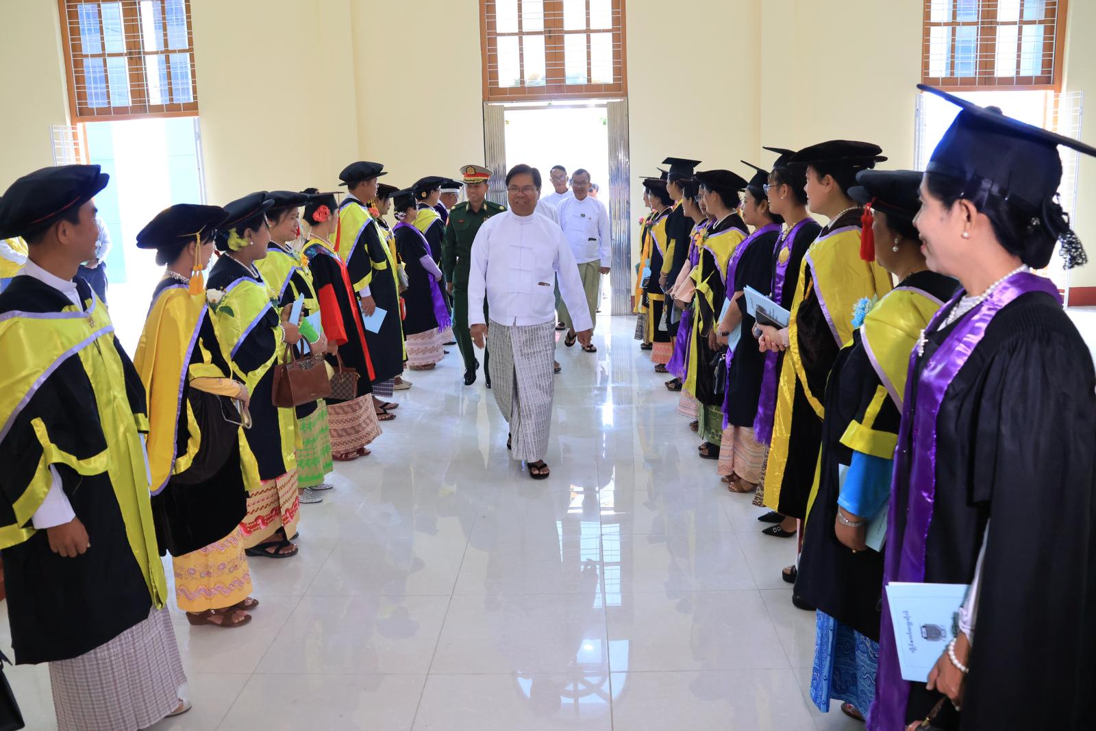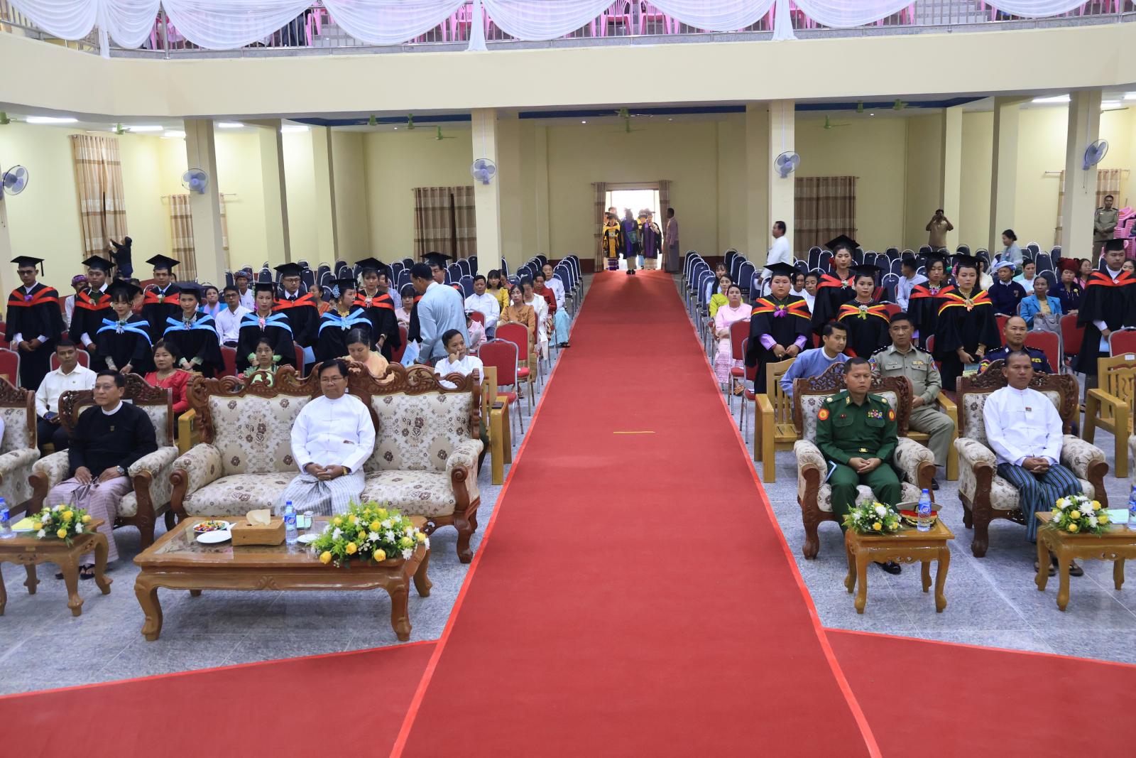 ဘွဲ့နှင်းသဘင်အခမ်းအနားအား အစီအစဉ်များအတိုင်းကျင်းပရာ နိုင်ငံတော်သီချင်း တီးခတ်စဉ် ပြည်နယ်ဝန်ကြီးချုပ်နှင့် ဧည့်သည်တော်များက နိုင်ငံတော်အလံအား အလေးပြုကြသည်။ ထို့နောက် ပါမောက္ခချုပ်က ဘွဲ့များအပ်နှင်းရန်အတွက် ဤဘွဲ့နှင်းသဘင်ကို ကျင်းပကြောင်း ကြေညာပြီးနောက် ဘွဲ့ရမောင်မယ်များက စောင့်ထိန်းရမည့်ကျင့်ဝတ်များကို လိုက်နာကျင့်သုံးရန် ကတိဝန်ခံမှုပြုစေသည်။
