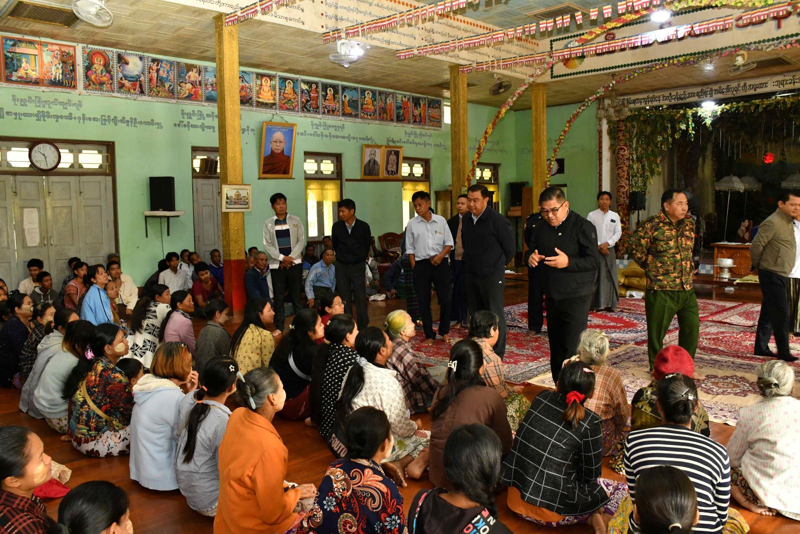 ထိုမှတစ်ဆင့် ပြည်နယ်ဝန်ကြီးချုပ်သည် မိုးညှင်းမြို့နယ် နားခါရပ်ကွက်အတွင်းရှိ ထီးလင်းကျောင်းတိုက်အတွင်း ယာယီခိုလှုံနေထိုင်လျက်ရှိသော စစ်ကိုင်းတိုင်းဒေသကြီး ကသာမြို့နယ်မှ ဝန်ထမ်းများ၊ ဒေသခံအိမ်ထောင်စုများနှင့် သွားရောက်တွေ့ဆုံပြီး ရှေးဦးစွာ ပြည်နယ်ဝန်ကြီးချုပ်က ကျောင်းထိုင်ဆရာတော်ထံ သာသနာရေးဆိုင်ရာကိစ္စရပ်များနှင့် ယခုလို ယာယီတိမ်းရှောင်ပြည်သူများအား ကူညီစောင့်ရှောက်မှုပေးခြင်းကို ကျေးဇူးတင်ကြောင်း လျှောက်ထားတင်ပြသည်။