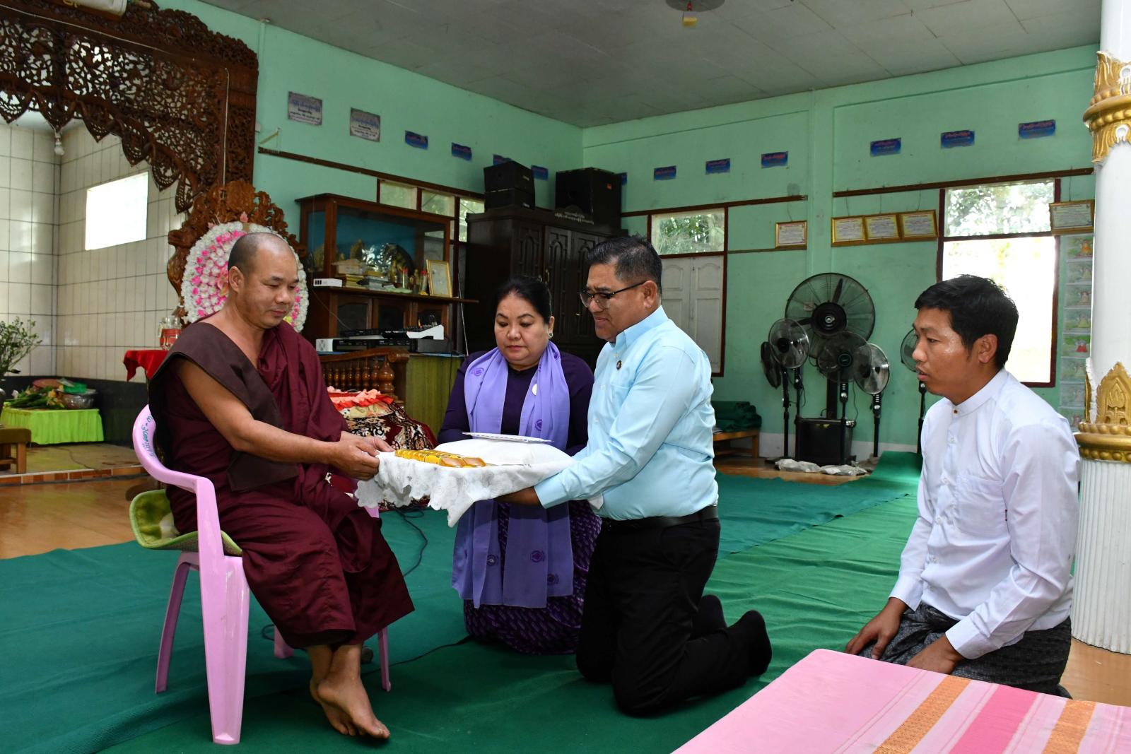 ဆက်လက်၍ ပြည်နယ်ဝန်ကြီးချုပ်နှင့် ဇနီးဒေါ်နန်ဆိုင်းတို့က ကျောင်းတိုက်အတွက် နဝကမ အလှူငွေနှင့်ကျောင်းတိုက်အတွင်း စစ်ကိုင်းတိုင်းဒေသကြီး ကသာမြို့နယ်မှ လာရောက်ခိုလှုံနေထိုင်လျက်ရှိသော ဝန်ထမ်းများနှင့် အိမ်ထောင်စုများအတွက် ဆန်အိတ် ၅ အိတ်နှင့် ဆီ ၂ ပုံးကို လည်းကောင်း၊ ပြည်နယ်ဝန်ကြီးနှင့် တာဝန်ရှိသူများက နဝကမအလှူငွေများကိုလှူဒါန်းခဲ့ကြရာ လှူဒါန်းမှုအစုစုတို့ အတွက်ရေစက်သွန်းချအမျှပေးဝေပြီး ပြည်နယ်ဝန်ကြီးချုပ်ကယာယီတိမ်းရှောင်မိသားစုများအား အားပေး စကားပြောကြားခဲ့သည်။