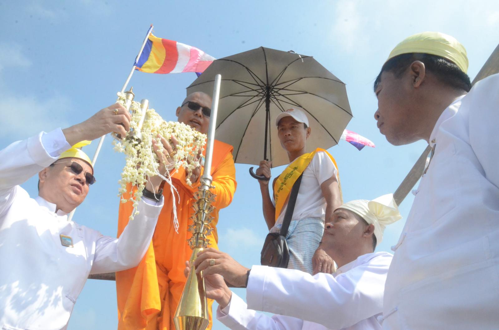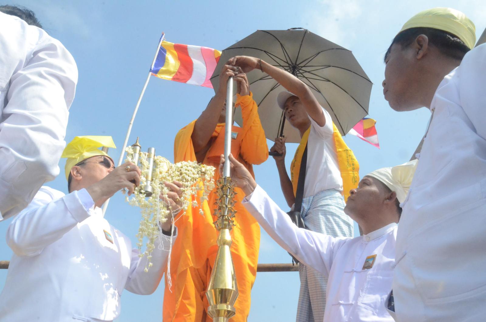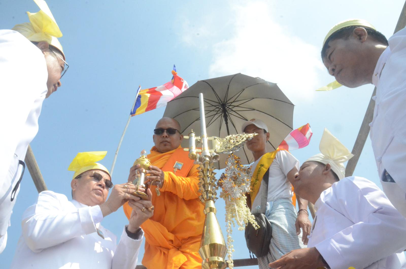 တာဝတိံသာစေတီတော်မြတ်ကြီး၏ အထက်ဌာပနာတော်သွင်းလှူခြင်း၊ အထွဋ်စေတီတော်အား ရွှေထီးတော်တင်လှူခြင်းနှင့် ဗုဒ္ဓဘိသေက အနေကဇာတင်လှူခြင်း အခမ်းအနားသို့ စေတီတော်တည်ဆောက်ရေး အကျိုးတော်ဆောင် ဆရာတော်၊ သံဃာတော်ကြီးများ၊ မြို့နယ်စီမံခန့်ခွဲရေးနှင့် အုပ်ချုပ်ရေးကော်မတီဥက္ကဋ္ဌ၊ ဦးဇော်ဝင်းလှိုင်နှင့် ကော်မတီဝင်များ၊ ဌာနဆိုင်ရာများ၊ စေတီတော်တည်ဆောက်ရေး ကော်မတီဝင်များနှင့် အကျိုးတော်ဆောင်များ၊ သာသနာ့ ဒါယကာ/ဒါယကာမများ တက်ရောက်ကြပြီး အခမ်းအနားအား နမောတဿ (၃)ကြိမ်ရွတ်ဆိုဖွင့်လှစ်ခဲ့သည်။