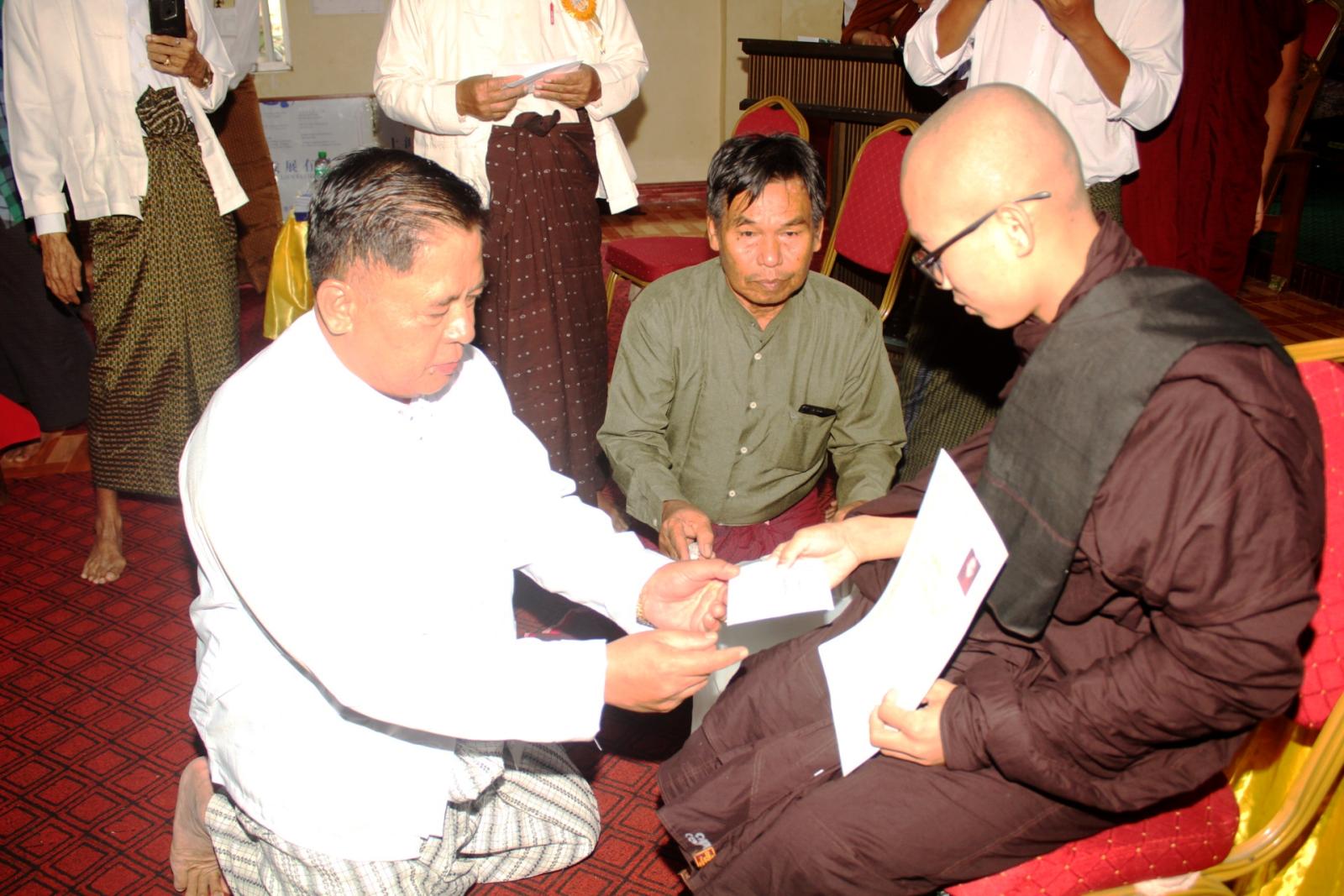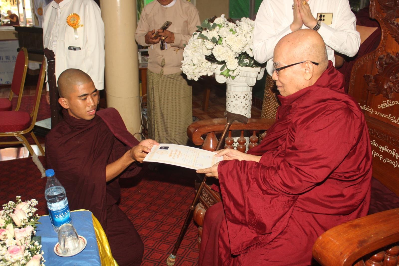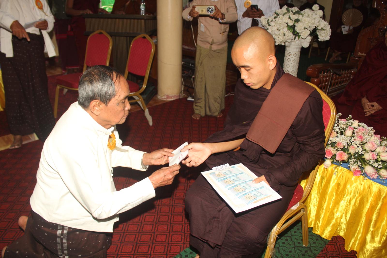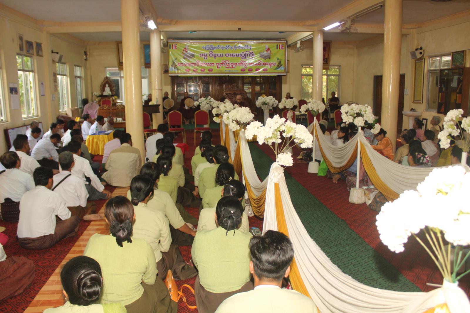 အခမ်းအနားတွင် နိုင်ငံတော်သြဝါဒါစရိယ စျေးဦးကျောင်းတိုက်ဆရာတော်ဦးသုမနထံမှငါးပါးသီလခံယူပြီး သြဝါဒကထာနာယူဆောက်တည်သည်။ ထို့နောက် မြို့နယ်စီမံခန့်ခွဲရေးနှင့်အုပ်ချုပ်ရေး ကော်မတီအတွင်းရေးမှူး ရဲမှူးအောင်နိုင်ဝင်းက သာသနာရေးဆိုင်ရာများလျောက်ထားခဲ့ပြီး ဓမ္မဝိနယ(၅၂)ကြိမ်မြောက်ပူဇော်ပွဲနှင့်စပ်လျဥ်း၍ မြို့နယ်ဓမ္မဝိနယအမှုဆောင်အဖွဲ့ဒုတိယဥက္ကဋ္ဌ ဦးချစ်တိုးက ကျေးဇူးတင်ဝမ်းမြောက်စကားပြောကြားသည်။ အဆိုပါဓမ္မဝိနယစာမေးပွဲကြီးတွင် ပထမကြီးတန်းအောင်(၃)ပါး၊ ပထမလတ်တန်းအောင်(၁၃)ပါး၊ ပထမငယ်တန်းအောင်(၁၇)ပါး၊ အခြေပြုမူလတန်း အောင်(၁၆)ပါးနှင့် သာမဏေမူလတန်းအောင်(၄၈)ပါး စုစုပေါင်း(၉၇)ပါးတို့ကို ပင့်ဆောင်ပူဇော်ကာ အောင်လက်မှတ်နှင့်တကွ စာအောင်ဆုများဆက်ကပ်လှူဒါန်းခဲ့ကြသည်။ ထို့နောက် လှူဒါန်းမှုအစုစုတို့အတွက် ရေစက်သွန်းချတရားနာယူခဲ့ကြကြောင်းသိရသည်။