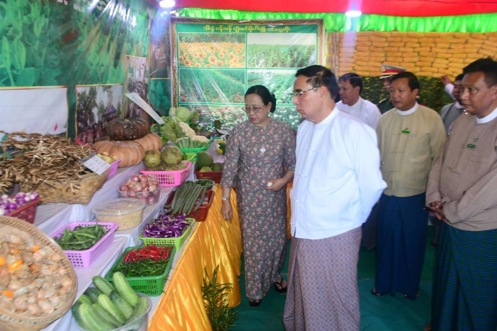 ထို့နောက် တိုင်းဒေသကြီး ဝန်ကြီးချုပ်၊ တိုင်းဒေသကြီး ဝန်ကြီးများနှင့် တာဝန်ရှိသူများက ပဲခူးခရိုင်၊ ညောင်လေးပင်ခရိုင်၊ တောင်ငူခရိုင်၊ ပြည်ခရိုင်၊ နတ်တလင်းခရိုင်နှင့် သာယာဝတီခရိုင် တို့မှ ဒေသထွက်သစ်သီးဝလံပန်းမန် ပြိုင်ပွဲဝင်သစ်သီးဝလံပန်းမန်များ ခင်းကျင်းပြသထားရှိမှု၊ လယ်ယာသုံးစက်ကိရိယာပြခန်း၊ မွေးမြူရေးဆိုင်ရာပြခန်းများ၊ ဌာနဆိုင်ရာအသိပညာပေးပြခန်းများ၊ မွေးမြူရေးစံပြခြံများ၊ ဒေသထွက်ကုန်အရောင်းပြခန်း စုစုပေါင်း ပြခန်း (၁၁၀)ကျော် ပြသထားမှုကို လှည့်လည်ကြည်ရှုအားပေးခဲ့ပြီး ဒေသထွက်ကုန်များအား နိုင်ငံစီးပွား မြှင့်တင်ရေးရန်ပုံငွေဖြင့် တန်ဖိုးမြှင့်ထုတ်ကုန်အဖြစ် တိုးတက်ထုတ်လုပ်နိုင်ရေး၊ ပြည်ပပို့ကုန်အဆင့်ထိမျှော်မှန်းထုတ်လုပ်ဆောင်ရွက်ရန်နှင့် ဒေသတွင်းစိုက်ပျိုးရေးနှင့် မွေးမြူရေးလုပ်ငန်းများ တိုးချဲ့ဆောင်ရွက်နိုင်ရေး တာဝန်ရှိသူများနှင့် ပေါင်းစပ်ညှိနှိုင်း ဆောင်ရွက်ပေးသည်။