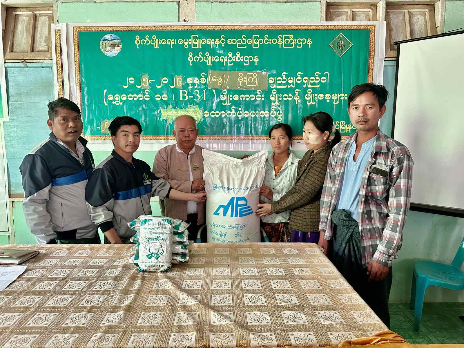 မန္တလေးတိုင်းဒေသကြီး၊ မိတ္ထီလာခရိုင် မလှိုင်မြို့နယ်စိုက်ပျိုးရေးဦးစီးဌာနက စီမံကိန်းတွင်ပါဝင်သော တောင်သူများအား ချည်မျှင်ရှည်ဝါ (ရွှေတောင်-၁၀)မျိုးစေ့များ ထောက်ပံ့ပေးအပ်ခြင်းကို မတ် ၂ ရက် နံနက် ၁၀ နာရီက မြို့နယ်စိုက်ပျိုးရေးဦးစီးဌာနရှိ အစည်းအဝေးခန်းမတွင် ကျင်းပသည်။