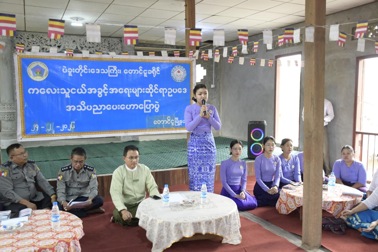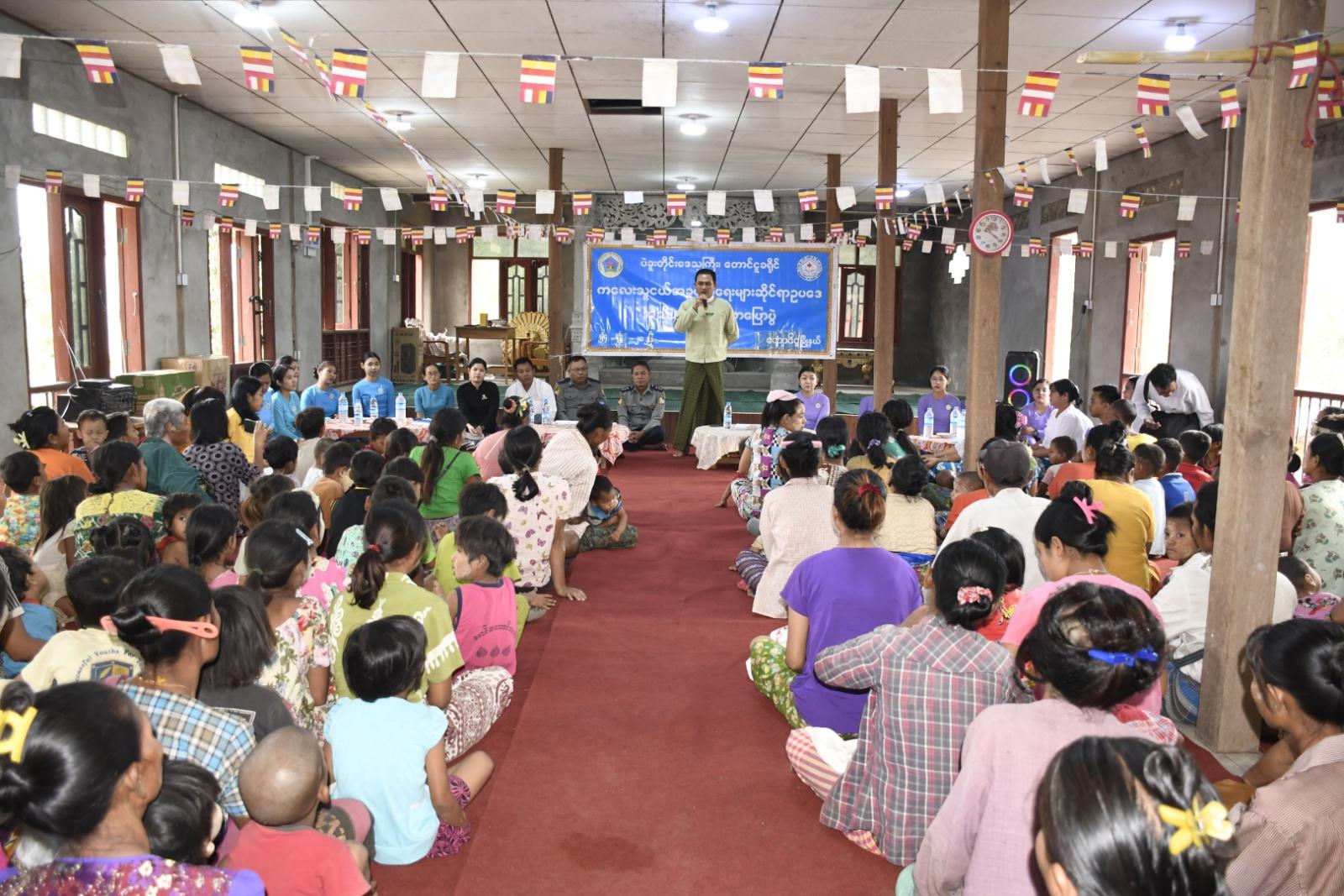 ပဲခူးတိုင်းဒေသကြီး၊ တောင်ငူခရိုင်၊ တောင်ငူမြို့နယ်၊ ကင်းဆိပ်ကျေးရွာအုပ်စု၊ စိန်ပန်းမြိုင်ကျေးရွာ သီရိဓမ္မနန္ဒာဘုန်းကြီးကျောင်း၌ ကလေးသူငယ်အခွင့်အရေးများဆိုင်ရာ ဥပဒေအသိပညာပေးဟောပြောပွဲကို ယမန်နေ့နံနက် (၁၀)နာရီအချိန်က ကျင်းပသည်။