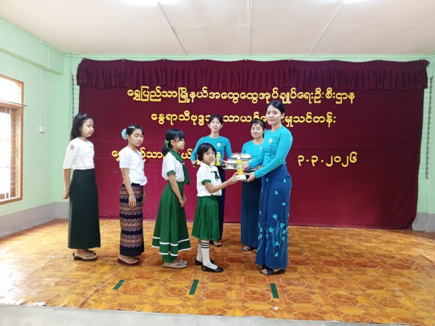 အခမ်းအနားတွင် မြို့နယ်အုပ်ချုပ်ရေးမှူး ဦးမြင့်ဦးက အဖွင့်အမှာစကားပြောကြားပြီး ယဉ်ကျေးလိမ္မာစာအုပ် အခြေခံဗုဒ္ဓဘာသာယဉ်ကျေးမှု သင်ခန်းစာစာအုပ်များကိုလည်းကောင်း၊ ဒုမြို့နယ်အုပ်ချုပ်ရေးမှူး ဦးစောသန့်ဇင်ဦးက ဗလာစာအုပ်များနှင့် ဘောပင်များ၊ မြို့နယ်အမျိုးသမီးရေးရာအဖွဲ့ဥက္ကဋ္ဌ ဒေါ်ယဉ်မေသွယ်က အချိုရည်ဘူးများနှင့် မုန့်များကို ပေးအပ်လှူဒါန်းခဲ့ကြောင်း သိရသည်။