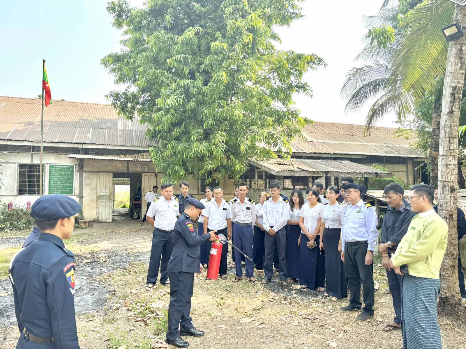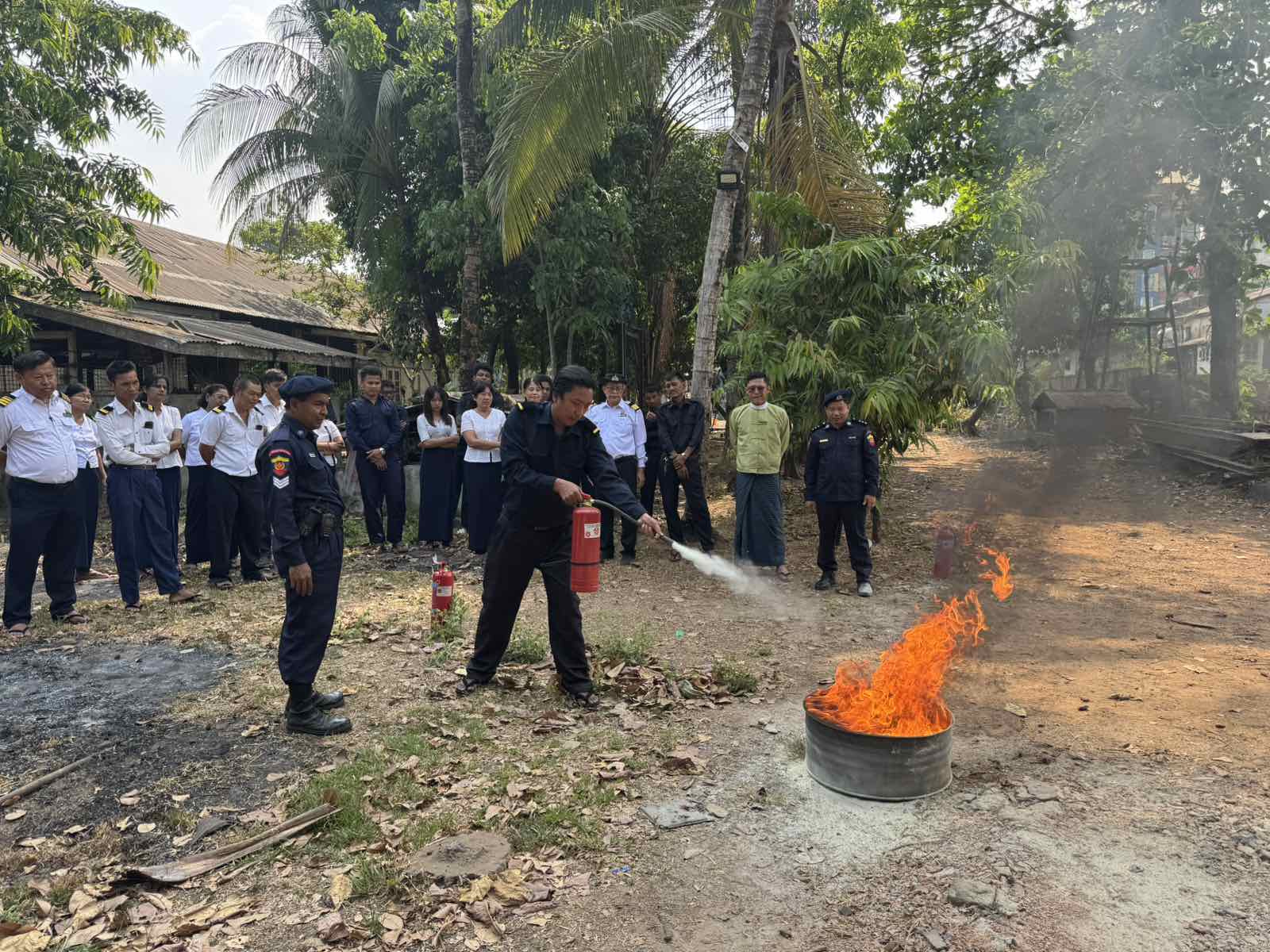 ထို့နောက် မြို့နယ်မီးသတ်ဦးစီးဌာနမှ ဆီမီးငြှိမ်းသတ်ရေး မီးသတ်ဆေးဘူးများနှင့် အသုံးပြုပုံတို့အား သရုပ်ပြသခဲ့ပြီး စက်ခေါင်းစက်ရုံ ဝန်ထမ်းများအား လက်တွေ့သရုပ်ပြငြှိမ်းသတ်စေခဲ့ခြင်းကို ဆောင်ရွက်ခဲ့ကြသည်။ အဆိုပါအသိပညာပေးဟောပြောပွဲနှင့် မီးငြှိမ်းသတ်သရုပ်ပြသခြင်းသို့ မြို့နယ်အထွေထွေအုပ်ချုပ်ရေးဦးစီးဌာန ဒုတိယမြို့နယ်အုပ်ချုပ်ရေးမှူး ဦးအောင်သူ မြန်မာ့မီးရထားမှ ဒုအထွေထွေမန်နေဂျာ ဦးကျော်မိုးဇော်၊ အင်ဂျင်နီယာမှူး (စက်မှု) ဦးမင်းသန်းဌေးနှင့် ဝန်ထမ်းများ၊ မြို့နယ်မီးသတ်ဦးစီးမှူး ဦးကျော်သန်းဌေးနှင့် သန္ဓေတပ်ဖွဲ့ဝင်များ တက်ရောက်ခဲ့ကြောင်း သိရသည်။