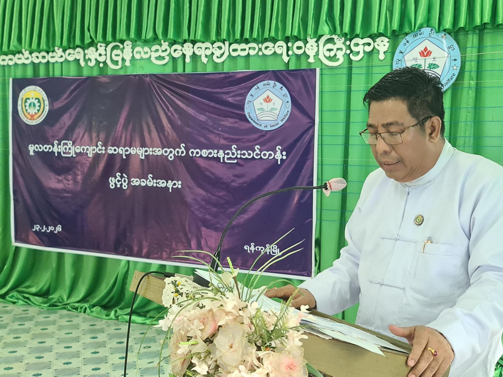 ဦးစွာ ရန်ကုန်တိုင်းဒေသကြီး ရှေးဦးအရွယ်ကလေးသူငယ်ပြုစုပျိုးထောင်ရေးနှင့် ဖွံ့ဖြိုးရေးလုပ်ငန်းကြီးကြပ်ရေးအဖွဲ့ဥက္ကဋ္ဌ လူမှုရေးရာဝန်ကြီး ဦးဌေးအောင်က အဖွင့်အမှာစကားပြောကြားခဲ့သည်။